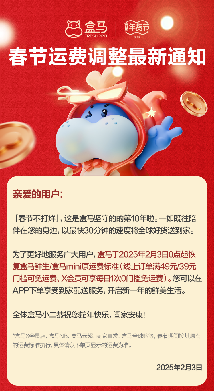 2月3日,盒馬鮮生官方服務(wù)號(hào)發(fā)布《春節(jié)運(yùn)費(fèi)調(diào)整最新通知》。 通知稱(chēng),盒馬于2025年2月3日0點(diǎn)起恢復(fù)盒馬鮮生/盒馬mini原運(yùn)費(fèi)標(biāo)準(zhǔn)(線上訂單滿(mǎn)49元/39元門(mén)檻可免運(yùn)費(fèi)X會(huì)員可享每日1次0門(mén)檻免運(yùn)費(fèi))。 據(jù)悉,此次調(diào)整比盒馬原定恢復(fù)原運(yùn)費(fèi)標(biāo)準(zhǔn)的日期提前了2天。 盒馬APP此前發(fā)布通知稱(chēng),2025年1月26日0點(diǎn)至2月4日24點(diǎn)(“春節(jié)期間”),所有用戶(hù)(含X會(huì)員)通過(guò)盒馬APP或盒馬第三方小程序等線上下單購(gòu)買(mǎi)盒馬門(mén)店的商品,任意金額訂單均收取6元/單運(yùn)費(fèi),具體盒馬門(mén)店范圍見(jiàn)備注。 對(duì)此,不少網(wǎng)友表示能夠理解,“大過(guò)年的,不容易”“合情合理”;也有網(wǎng)友表示:補(bǔ)貼應(yīng)該由商家買(mǎi)單。 根據(jù)盒馬與第一財(cái)經(jīng)新一線城市研究所聯(lián)合發(fā)布的《2024盒區(qū)房消費(fèi)趨勢(shì)洞察報(bào)告》,蛇年春節(jié)前,盒馬預(yù)計(jì)近一年開(kāi)出72家門(mén)店,其中包括62家盒馬鮮生和10家盒馬mini店,全國(guó)盒馬鮮生門(mén)店總數(shù)接近430家。 |