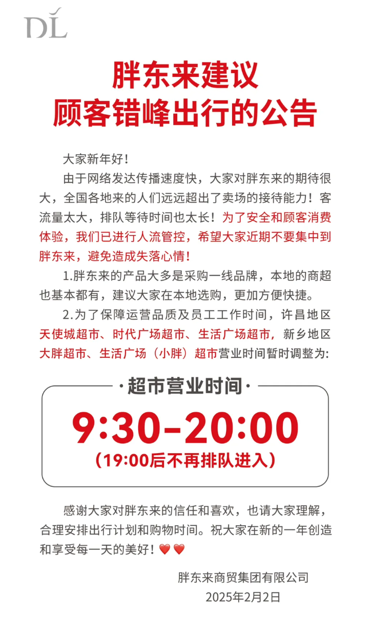2月2日,農(nóng)歷正月初五,民間迎財(cái)神的傳統(tǒng)日子,各地眾多商家紛紛選在這天開門迎客。 在結(jié)束春節(jié)5天假期后,胖東來(lái)首日恢復(fù)營(yíng)業(yè),便迎來(lái)了洶涌人潮,門店現(xiàn)場(chǎng)被顧客圍得水泄不通。 抖音平臺(tái)多名網(wǎng)友發(fā)布視頻顯示,當(dāng)日清晨六點(diǎn)多,天色尚未大亮,胖東來(lái)天使城、時(shí)代廣場(chǎng)等門店前就已排起長(zhǎng)隊(duì),眾多顧客早早前來(lái)等候。 開業(yè)當(dāng)日,胖東來(lái)天使城、時(shí)代廣場(chǎng)、健康路等多個(gè)門店內(nèi)人頭攢動(dòng),店外來(lái)自全國(guó)各地的車輛在低溫中排起長(zhǎng)龍,等待進(jìn)入超市。 由于客流量遠(yuǎn)超賣場(chǎng)承載能力,門店不得不采取限流措施,超市張貼的告示明確告知顧客:“超市已限流,預(yù)計(jì)排隊(duì)3小時(shí)以上,建議前往其他門店選購(gòu)”。 鑒于此,為保障顧客安全與消費(fèi)體驗(yàn),胖東來(lái)迅速通過(guò)旗下“胖東來(lái)商貿(mào)集團(tuán)”“胖東來(lái)唯初珠寶”“胖東來(lái)天使城”等多個(gè)官方公眾號(hào)發(fā)布“建議顧客錯(cuò)峰出行公告”。 與此同時(shí),為應(yīng)對(duì)客流高峰,許昌市政府也做了一些列充分的部署,安排公安、城管(綜合執(zhí)法)、義工等多方力量,協(xié)助胖東來(lái)做好服務(wù)與安保工作。 此前春節(jié)期間,胖東來(lái)所有門店統(tǒng)一放假5天(期間其醫(yī)藥分店堅(jiān)持24小時(shí)值班),2月1日,胖東來(lái)商貿(mào)集團(tuán)通過(guò)公眾號(hào)發(fā)布通知,宣布所有門店于2月2日(正月初五)正常營(yíng)業(yè),同時(shí),為便利顧客春節(jié)購(gòu)物,還特別安排2月4日(正月初七)這一原本的休息日正常開門。 作為深耕河南市場(chǎng)近三十年的本土零售企業(yè),胖東來(lái)憑借先進(jìn)的企業(yè)文化與科學(xué)的經(jīng)營(yíng)模式,早已成為行業(yè)標(biāo)桿。2024年,其對(duì)步步高、永輝等多家企業(yè)的幫扶調(diào)改成效顯著,引發(fā)行業(yè)及輿論廣泛關(guān)注,“胖東來(lái)式調(diào)改”開創(chuàng)行業(yè)全新范例,胖東來(lái)也當(dāng)之無(wú)愧地成為中國(guó)美好商業(yè)的領(lǐng)航者,以自身實(shí)踐及各地標(biāo)桿項(xiàng)目,為中國(guó)商業(yè)發(fā)展持續(xù)注入動(dòng)力。 此次節(jié)后開業(yè)的火爆場(chǎng)面,既展現(xiàn)出胖東來(lái)強(qiáng)大的市場(chǎng)號(hào)召力,也凸顯了消費(fèi)者對(duì)其的高度認(rèn)可,也預(yù)示著胖東來(lái)帶來(lái)的商業(yè)美好,將會(huì)在新的一年獲得延續(xù)和發(fā)展。 |