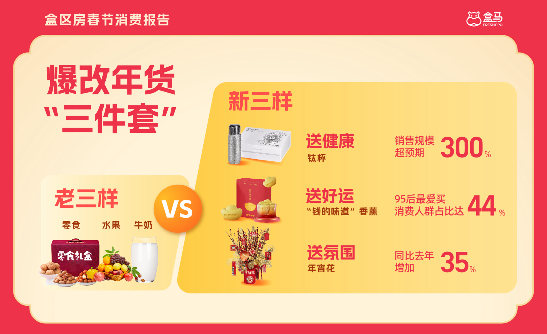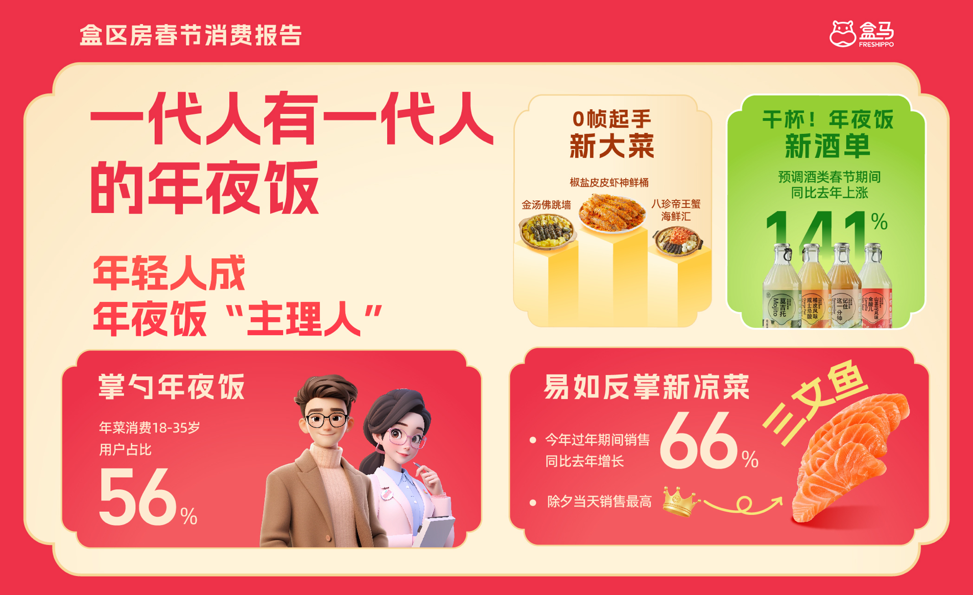 熱鬧的春節(jié)長假落下帷幕。2月5日,盒馬發(fā)布的《2025盒區(qū)房春節(jié)消費報告》(以下簡稱“報告”)顯示,18-35歲年輕人已經(jīng)成為盒區(qū)房的春節(jié)“主理人”,全權接手辦年貨,準備年夜飯,營造過年氛圍等事項。在他們的主導下,春節(jié)消費也開始顯現(xiàn)新趨勢:“賽博”年菜增長翻倍;“小甜水”爆發(fā)式增長;三文魚成最受歡迎的“涼菜”……此外,更新奇、情緒價值以及性價比拉滿的“情價比”好貨成為最受年輕人青睞的春節(jié)伴手禮。 年輕人掌勺,“爆改”年夜飯 《報告》顯示,盒馬年菜銷售同比增長了42%,下單購買年菜的18-35歲的年輕消費者占比達56%,不同于老一輩,這屆年輕人更喜歡現(xiàn)吃現(xiàn)買。盒馬年菜的銷售高峰除夕當天,八珍帝王蟹海鮮匯、海膽水餃以及潮汕鹵味拼盤等快手菜最受歡迎,不難看出,年輕一代的年夜飯“主理人”們在選購半成品年菜時青睞制作難度更大的硬菜。 除了半成品大菜外,鮮活帝王蟹、可生食三文魚也是除夕當天的銷售翹楚。盒馬數(shù)據(jù)顯示,春節(jié)期間,鮮活帝王蟹銷售同比增長超70%,全國多地門店整個春節(jié)期間的存貨都被一搶而空,成為不少“盒區(qū)”家庭年夜飯的“C位”?缮橙聂~銷量在除夕當天站上銷售最高峰,被不少年輕人“爆改”成了新式?jīng)霾恕?/div> 春節(jié)是酒類的銷售旺季,通過年輕“主理人”的操辦,年夜飯餐桌上的酒水也在發(fā)生變化。比起父輩們推杯換盞的白酒、紅酒,年輕人更愛選擇雞尾酒、精釀等微醺“小甜水”!秷蟾妗凤@示,春節(jié)期間盒馬酒類商品的銷售整體同比增長22%,其中預調(diào)酒類增幅高達141%,精釀鮮啤同比增長74%,已然成為拉動春節(jié)酒類增長的新動力。 老年貨變“新三樣” 悅己消費趨勢下,年輕一代購買年貨既注重商品承載的情感價值,又精打細算追求最高品質(zhì),展現(xiàn)出更加獨特的消費哲學!秷蟾妗凤@示,送健康、送好運、送氛圍是今年置辦年貨的關鍵詞。 盒馬蛇年首個出圈年貨當屬“錢的味道”、“上上簽”兩款香薰禮盒!秷蟾妗凤@示,購買這兩款香薰的95后消費者占比達44%。 此外,鈦杯也成為今年最“拿得出手”的年禮之一。今年購買鈦杯禮盒的消費者年齡集中在18-35歲,這款主打輕便不串味的“黑科技”水杯成為了年輕人送禮的“硬通貨”。 在年宵花的購買選擇上,許多消費者依然保留著對傳統(tǒng)色彩的偏好。盒馬數(shù)據(jù)顯示,蛇年年宵花銷售前五名均為紅色系,其中鮮切花中的蝴蝶蘭、銀柳,禮盒類的“有錢花”、“隨便花”擺件等有“招財”寓意的花束最受歡迎。 “賽博”年菜解放雙手 與過去大包小包回家過年的架勢不同,如今的年輕人輕裝上陣,用“電子年菜”解放雙手。 從2024年12月開始,盒馬的“云超送全國”業(yè)務進一步升級,覆蓋全國大部分“非盒區(qū)”,未開設盒馬門店的城市消費者也能通過官方網(wǎng)購渠道買到正宗盒馬年貨。同時,今年是盒馬云超第二年在線上售賣年菜,不少除夕還在趕路的返鄉(xiāng)人可以提前下單——人沒到家,年貨先到家。數(shù)據(jù)顯示,佛跳墻、八珍帝王蟹海鮮匯等“硬菜”最受歡迎,整體銷售額同比激增216%。 此外,盒馬今年從初六開始恢復線上訂單滿額免運費的收費標準,便于提前返城的消費者準備復工餐。 |