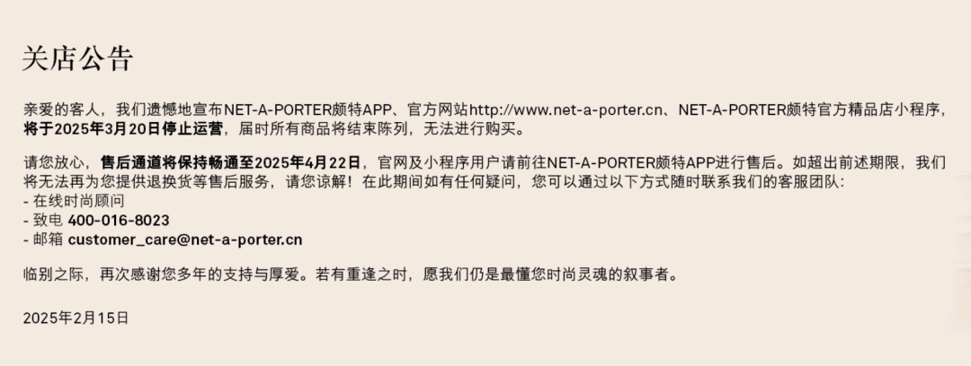 | 2月17日消息,奢侈品電商平臺(tái)Net-a-Porter近日發(fā)布公告稱,公司將于3月20日關(guān)閉包括天貓、微信小程序、小紅書、抖音旗艦店、公司網(wǎng)站和App在內(nèi)的所有中國(guó)線上渠道,并于4月22日終止售后服務(wù)。 |