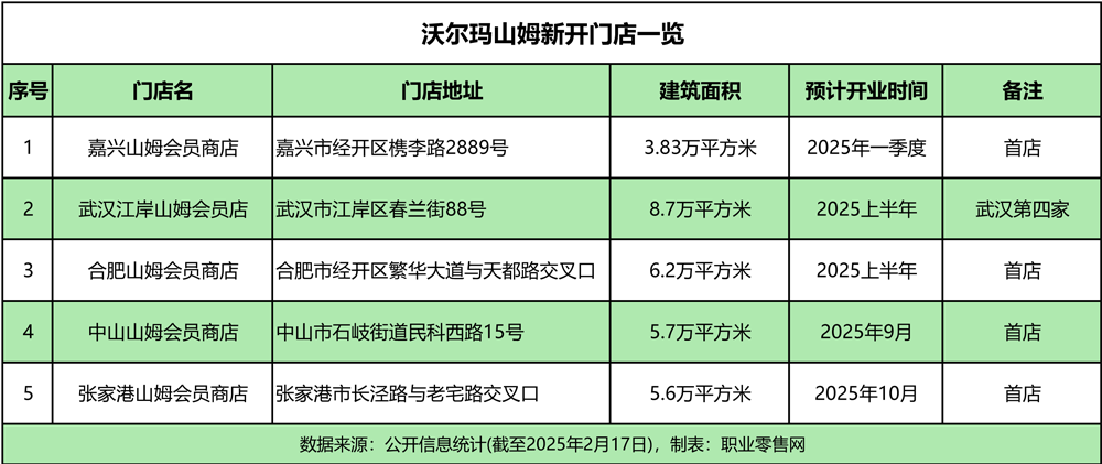 繼續(xù)加碼擴張,山姆中國發(fā)布新店招聘信息,5家新店即將陸續(xù)開業(yè)。 《職業(yè)零售網(wǎng)》獲悉,2月17日,沃爾瑪招聘官方公眾號發(fā)布了“2月份新店招聘信息”,宣布山姆會員店將在嘉興、合肥、武漢、中山、張家港等五座城市開設(shè)新店,并在積極招聘相關(guān)工作人員。 與1月份發(fā)布的招聘信息相比,本次新增了中山店和張家港店。 據(jù)公開信息顯示,合肥店、嘉興店和武漢江岸店都預計將于今年上半年開業(yè)。其中,嘉興店預計是2025年首店,將于一季度開業(yè);武漢江岸店已正式掛牌,預計2025年上半年;合肥山姆會員商店也計劃于2025年上半年正式營業(yè)。此外,中山店和張家港店也在緊鑼密鼓地籌備中,力爭在2025年內(nèi)開業(yè)。 招聘信息顯示,此次新店招聘涉及多個職位,包括營運副總、生鮮主廚、樓面主管、員工/員工主管、會籍銷售/云倉/海鮮肉類/餐吧主管、肉類/熟食/面包/餐吧/維修技工、人事行政經(jīng)理、員工/員工指導等崗位。 武漢江岸山姆會員商店,位于江岸區(qū)春蘭街星悅城四期對面(春蘭街88號),西鄰姑嫂樹立交橋,北臨三環(huán)線,是躍進集團躍立方項目的重要組成部分。該項目占地面積約2.7萬平方米,總建筑面積約為8.6萬平方米,并配備了超過1000個會員專屬停車位。今年1月24日,江岸山姆會員店已正式掛牌。此前,原計劃于2024年底開業(yè),但目前預計開業(yè)時間將延期至2025年上半年。 目前,武漢在運營和在建的山姆會員店已經(jīng)有4家,包括:2014年開業(yè)的硚口店、2021年開業(yè)的光谷店、2023年開業(yè)的漢陽店以及即將開業(yè)的江岸店。 圖來源:湖北日報。 嘉興山姆會員商店,位于經(jīng)開區(qū)槜李路2889號,是山姆在嘉興第一家門店。項目總建筑面積約3.83萬平方米,分地上二層和地下二層,其中地上是商店,地下是停車場。據(jù)嘉興經(jīng)區(qū)管委會發(fā)布的信息,嘉興山姆會員商店力爭在今年12月完成室內(nèi)裝修。據(jù)媒體報道,嘉興山姆會員商店將在2025年3月正式開業(yè)。 合肥山姆會員商店,位于經(jīng)開區(qū)天都路與繁華大道交口西北角,這是安徽首家山姆會員店。該項目的建筑面積約6.2萬平方米,地上一層為商業(yè)部分,地下兩層為停車場。去年年底(即2024年12月24日起),合肥山姆會員商店正式推出了“極速達”服務(wù),該服務(wù)初期覆蓋了包河區(qū)與蜀山區(qū)。未來,該服務(wù)可能會進一步擴展至其他區(qū)域。根據(jù)合肥市商務(wù)局消息,合肥山姆會員商店將于2025年上半年正式營業(yè)。 中山山姆會員商店,位于中山市石岐街道民科西路15號,賣場建筑面積約5.7萬平方米,配套商業(yè)面積約1.3萬平方米。地上建筑共有3層,分別用作商業(yè)超市和停車層。該店秉持可持續(xù)發(fā)展理念,致力于實現(xiàn)建筑全壽命周期的資源節(jié)約和環(huán)境保護,將成為大灣區(qū)首家達到國家綠色建筑三星級標準的山姆會員店。據(jù)媒體報道,該項目已于2024年11月22日封頂,計劃于2025年3月交付山姆進行二次裝修,爭取在8月份竣工驗收,力爭在2025年9月開業(yè)。 張家港山姆會員商店,位于張家港市長涇路與老宅路交叉口,這是山姆在蘇州地區(qū)開設(shè)的第4家門店,同時也是繼福建泉州、晉江門店之后,山姆在全國范圍內(nèi)開業(yè)的第三個縣市級門店。 據(jù)悉,張家港城投集團特別為山姆量身打造了高端商貿(mào)體,該項目占地面積達62.83畝,總建筑面積約為5.6萬平方米。其中,一樓設(shè)有近2萬平方米的寬敞購物空間,而二樓、三樓及地面總計擁有超1000個會員專享停車位。 目前,項目土建結(jié)構(gòu)已全部封頂,墻體完成約90%,首層機電管線安裝完成約80%。根據(jù)計劃,項目將于3月底移交山姆開展室內(nèi)裝飾施工,同步開展幕墻、室外配套及景觀綠化的施工,預計今年下半年將建成投用。 圖來源:沃爾瑪招聘。 山姆會員店于1996年8月首次進入中國市場,在深圳福田區(qū)開設(shè)了第一家門店。經(jīng)過近30年的發(fā)展,山姆已成為沃爾瑪集團的重要增長引擎。 據(jù)沃爾瑪近期公布的2024財年第三季財報(數(shù)據(jù)截至2024年11月)顯示,沃爾瑪中國銷售額約為148億美元,折合人民幣約為1078.72億元,其中山姆的銷售額預計超過900億元,占比超過8成。第三季度,山姆線上凈銷售額增長25%,會員收入增長22%。目前,山姆在中國已連續(xù)多個季度保持雙位數(shù)增長,進入市場“狂飆”階段。 在2024年,山姆會員店在中國市場的新店開業(yè)數(shù)量達到了6家,與2022年的歷史紀錄持平。這些新店包括泉州晉江店、溫州鹿城店、南京江北店、成都武侯店、東莞寮步店和紹興越城店。隨著這些新店的開業(yè),山姆會員店在中國的門店數(shù)量增加至53家,覆蓋了全國29個城市。 沃爾瑪去年曾公開表示,未來每年都將有6-7家新店的規(guī)劃。從目前的進展來看,山姆會員店已經(jīng)成功實現(xiàn)了這一目標。 未來,山姆會員店還將繼續(xù)加速在中國市場的布局。據(jù)不完全統(tǒng)計,山姆計劃在2025年至2027年期間,在全國至少新開21家門店,這些新店將分布在北京、上海、深圳、廣州、蘇州、西安、武漢、合肥、佛山、石家莊、青島、鄭州、臺州等城市,進一步拓寬其服務(wù)范圍。 值得一提的是,除了已公布的嘉興店、合肥店、武漢江岸店、張家港店