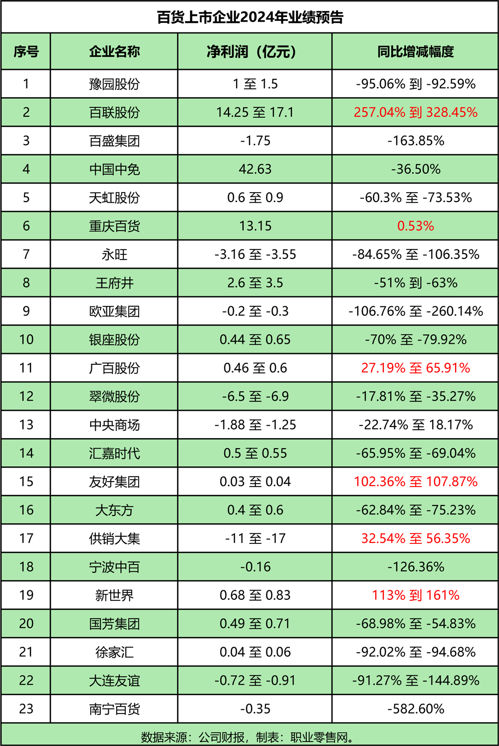 近日,多家百貨上市企業(yè)披露了2024年度業(yè)績預(yù)告,為了更全面的觀察國內(nèi)百貨業(yè)企業(yè)運(yùn)營狀態(tài)和業(yè)績變化,我們對這些企業(yè)進(jìn)行了業(yè)績數(shù)據(jù)統(tǒng)計(jì)。 據(jù)我們統(tǒng)計(jì)發(fā)現(xiàn),截至目前已經(jīng)有23家百貨上市公司披露了2024年業(yè)績預(yù)告,其中有9家出現(xiàn)虧損,占比約為39.13%;其中寧波中百、歐亞集團(tuán)、百盛集團(tuán)盈轉(zhuǎn)虧,供銷大集虧損收窄,永旺、翠微股份、中央商場、大連友誼、南寧百貨虧損增加。 同時(shí),有6家企業(yè)凈利潤實(shí)現(xiàn)增長,約占總數(shù)的26.09%,其中百聯(lián)股份、重慶百貨、廣百股份、新世界凈利潤增加,友好集團(tuán)成功實(shí)現(xiàn)扭虧為盈。 另外,有17家企業(yè)凈利潤出現(xiàn)下滑,約占總數(shù)的73.91%。其中,供銷大集虧損最為嚴(yán)重,2024年虧損11億元至17億元;而最賺錢的則為中國中免,2024年凈利潤為42.63億元。 1、豫園股份:凈利潤同比減少95.06%到92.59% 豫園股份發(fā)布2024年度業(yè)績預(yù)告,預(yù)計(jì)實(shí)現(xiàn)歸屬于上市公司母公司所有者的凈利潤為1億元到1.5億元,與上年同期相比,將減少192,406.49萬元到187,406.49萬元,同比減少95.06%到92.59%;扣除非經(jīng)常性損益后的凈利潤預(yù)計(jì)虧損在20.5億元至22億元之間,與上年同期相比,將減少174,883.68萬元到159,883.68萬元,同比下降幅度為354.38%至387.63%。 業(yè)績預(yù)減的主要原因是,復(fù)合功能地產(chǎn)業(yè)務(wù)受房地產(chǎn)行業(yè)整體下行影響,毛利率同比下降;消費(fèi)行業(yè)結(jié)構(gòu)性調(diào)整,部分產(chǎn)業(yè)板塊發(fā)展承壓,營業(yè)收入和綜合銷售毛利下降;以及對存在減值跡象的房地產(chǎn)項(xiàng)目及商譽(yù)等計(jì)提資產(chǎn)減值準(zhǔn)備。公司將繼續(xù)聚焦主業(yè)發(fā)展,提升資源組合和配置能力,推動(dòng)高質(zhì)量發(fā)展新動(dòng)能。 2、百聯(lián)股份:凈利潤大增257.04%-328.45% 百聯(lián)股份發(fā)布業(yè)績預(yù)告顯示,2024年實(shí)現(xiàn)歸屬于上市公司股東的凈利潤為14.25億元至17.1億元,與去年同期的3.99億元相比,將增加10.26億元至13.11億元,同比增加257.04%到328.45%左右。 凈利潤實(shí)現(xiàn)增長主要原因系公司發(fā)行華安百聯(lián)消費(fèi)REIT取得投資收益所致。報(bào)告期內(nèi)公司以上海又一城購物中心作為底層資產(chǎn)于2024年8月成功發(fā)行華安百聯(lián)消費(fèi)REIT,有利于公司打造消費(fèi)基礎(chǔ)設(shè)施的“投、融、建、管、退”完整閉環(huán),實(shí)現(xiàn)自有物業(yè)的自我循環(huán)和良性發(fā)展。 3、百盛集團(tuán):預(yù)虧損1.75億元 百盛集團(tuán)發(fā)布盈利警告,預(yù)計(jì)截至2024年12月31日止年度,公司所有人應(yīng)占虧損約為人民幣1.75億元,相較于2023年同期錄得的人民幣6640萬元利潤,出現(xiàn)顯著虧損。 公告指出,此次虧損主要由于經(jīng)營收益總額較去年同期下降約10.8%,該下降主要由于經(jīng)濟(jì)復(fù)蘇低于預(yù)期,導(dǎo)致消費(fèi)降級,消費(fèi)者在消費(fèi)時(shí)更為謹(jǐn)慎。截至2024年9月30日,百盛集團(tuán)在中國及老撾運(yùn)營的百盛門店總數(shù)為43家,包括百貨店、購物廣場、城市奧特萊斯、'Parkson Beauty'概念店及超市,以及2家百盛優(yōu)客城市廣場。 4、中國中免:凈利潤42.63億元 中國中免發(fā)布業(yè)績快報(bào)顯示,2024年實(shí)現(xiàn)營業(yè)收入564.92億元,同比下降16.36%;實(shí)現(xiàn)歸屬于上市公司股東的凈利潤42.63億元,同比下降36.50%。 報(bào)告期內(nèi),中國中免的海南離島免稅市場份額同比提升近2個(gè)百分點(diǎn);機(jī)場免稅業(yè)務(wù)持續(xù)向好,北京機(jī)場(含首都國際機(jī)場、大興國際機(jī)場)免稅門店收入同比增長超過115%,上海機(jī)場(含浦東國際機(jī)場、虹橋國際機(jī)場)免稅門店收入同比增長近32%。 至于業(yè)績減幅超30%的原因,中國中免解釋,主要是受消費(fèi)需求放緩及行業(yè)周期影響,公司經(jīng)營業(yè)績持續(xù)承壓。 5、天虹股份:預(yù)計(jì)凈利潤下降60.3%至73.53% 天虹股份發(fā)布業(yè)績預(yù)告顯示,預(yù)計(jì)2024年度歸母凈利潤將在6000萬元至9000萬元之間,同比下降60.3%至73.53%。上年同期歸母凈利潤為2.27億元,顯示出顯著的業(yè)績下滑。扣除非經(jīng)常性損益后的凈利潤盈利1000萬元至1500萬元,比上年同期下降88.30%至92.20%。 業(yè)績變動(dòng)原因方面,天虹股份指出,國內(nèi)消費(fèi)者信心指數(shù)低位運(yùn)行、零售市場競爭加劇導(dǎo)致公司經(jīng)營業(yè)績承壓,整體銷售額同比略有下降。另外,公司通過購物中心調(diào)改升級、百貨業(yè)態(tài)轉(zhuǎn)型以及超市業(yè)態(tài)商品與組織變革調(diào)整等措施,實(shí)現(xiàn)了銷售額的同比較好增長、部分門店客流和銷售提升以及銷售額同比降幅收窄。 報(bào)告期內(nèi)費(fèi)用總額同比實(shí)現(xiàn)下降,有助于降低成本、提高效率。上年度關(guān)閉3家長期虧損門店,影響本年度歸母凈利潤同比下降約0.91億元。 6、重慶百貨:實(shí)現(xiàn)凈利潤13.15億元 重慶百貨發(fā)布2024年度業(yè)績快報(bào)顯示,2024年度營業(yè)總收入171.16億元,同比下降9.89%;營業(yè)利潤為14.51億元,同比增長1.76%;利潤總額