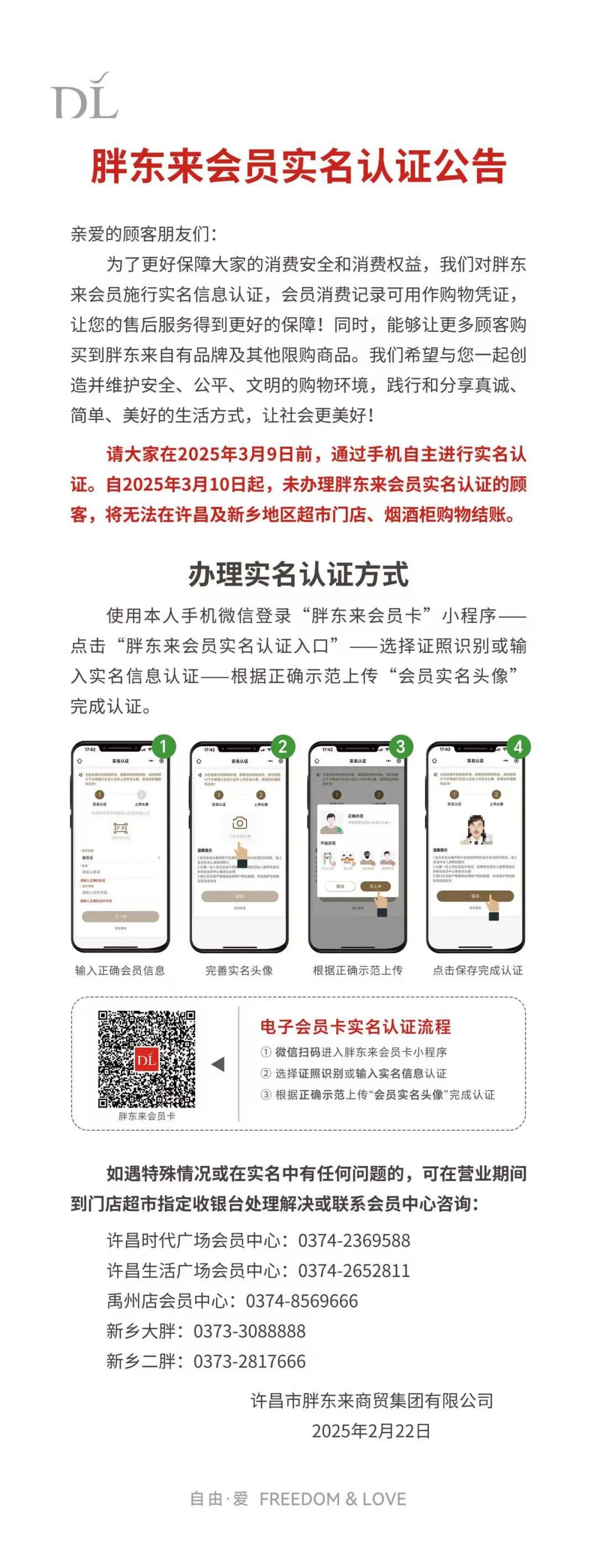 胖東來(lái)近日發(fā)布了會(huì)員實(shí)名認(rèn)證公告。公告要求所有胖東來(lái)會(huì)員在2025年3月9日前通過(guò)手機(jī)自主完成實(shí)名認(rèn)證。自2025年3月10日起,未辦理實(shí)名認(rèn)證的會(huì)員將無(wú)法在許昌及新鄉(xiāng)地區(qū)的超市門店、煙酒柜進(jìn)行購(gòu)物結(jié)賬。 此次實(shí)名認(rèn)證旨在讓會(huì)員的消費(fèi)記錄成為有效的購(gòu)物憑證,從而為消費(fèi)者提供更好的售后服務(wù)保障。 同時(shí),實(shí)名認(rèn)證也有助于胖東來(lái)維護(hù)購(gòu)物環(huán)境的安全、公平與文明,讓更多顧客能夠購(gòu)買到胖東來(lái)自有品牌及其他限購(gòu)商品。胖東來(lái)表示,他們希望與消費(fèi)者一起創(chuàng)造并維護(hù)這樣的購(gòu)物環(huán)境,踐行和分享真誠(chéng)、簡(jiǎn)單、美好的生活方式,共同讓社會(huì)更美好。 |