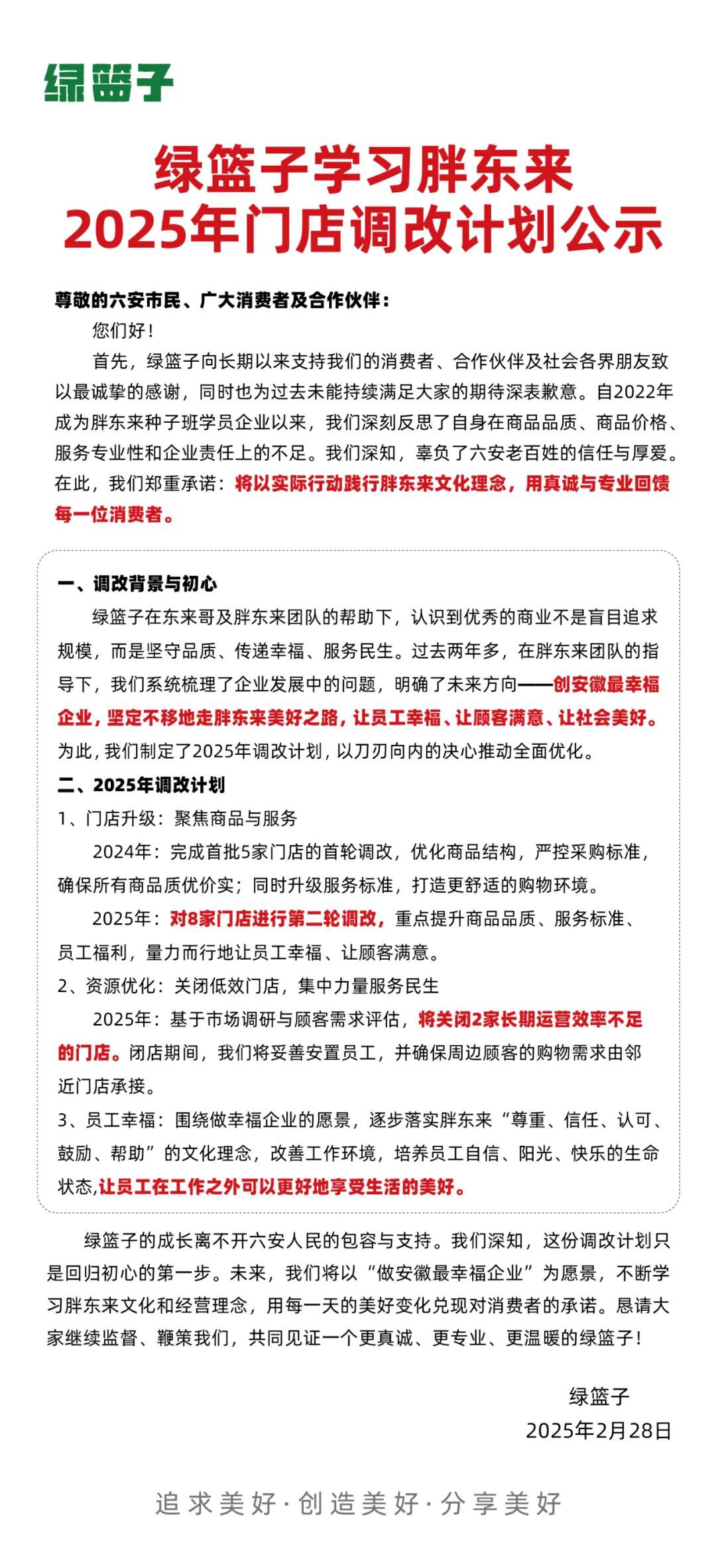 2月28日,安徽綠籃子公布了2025年門(mén)店調(diào)改計(jì)劃。 作為聯(lián)商?hào)|來(lái)商業(yè)研究院種子班企業(yè),綠籃子在東來(lái)哥及胖東來(lái)團(tuán)隊(duì)的幫助下,認(rèn)識(shí)到優(yōu)秀的商業(yè)不是盲目追求規(guī)模,而是堅(jiān)守品質(zhì)、傳遞幸福、服務(wù)民生。 過(guò)去兩年多,在胖東來(lái)團(tuán)隊(duì)的指導(dǎo)下,綠籃子系統(tǒng)梳理了企業(yè)發(fā)展中的問(wèn)題,明確了未來(lái)方向——?jiǎng)?chuàng)安徽最幸福企業(yè),堅(jiān)定不移地走胖東來(lái)美好之路,讓員工幸福、讓顧客滿(mǎn)意、讓社會(huì)美好。為此,綠籃子制定了2025年調(diào)改計(jì)劃,以刀刃向內(nèi)的決心推動(dòng)全面優(yōu)化。綠籃子鄭重承諾:將以實(shí)際行動(dòng)踐行胖東來(lái)文化理念,用真誠(chéng)與專(zhuān)業(yè)回饋每一位消費(fèi)者。 綠籃子2025年調(diào)改計(jì)劃: 1、門(mén)店升級(jí):聚焦商品與服務(wù): 2024年:完成首批5家門(mén)店的首輪調(diào)改,優(yōu)化商品結(jié)構(gòu),嚴(yán)控采購(gòu)標(biāo)準(zhǔn)確保所有商品質(zhì)優(yōu)價(jià)實(shí);同時(shí)升級(jí)服務(wù)標(biāo)準(zhǔn),打造更舒適的購(gòu)物環(huán)境。2025年:對(duì)8家門(mén)店進(jìn)行第二輪調(diào)改,重點(diǎn)提升商品品質(zhì)、服務(wù)標(biāo)準(zhǔn)員工福利,量力而行地讓員工幸福、讓顧客滿(mǎn)意。 2、資源優(yōu)化:關(guān)閉低效門(mén)店,集中力量服務(wù)民生: 2025年:基于市場(chǎng)調(diào)研與顧客需求評(píng)估,將關(guān)閉2家長(zhǎng)期運(yùn)營(yíng)效率不足的門(mén)店。閉店期間,我們將妥善安置員工,并確保周邊顧客的購(gòu)物需求由鄰近門(mén)店承接。 3、員工幸福: 圍繞做幸福企業(yè)的愿景,逐步落實(shí)胖東來(lái)“尊重、信任、認(rèn)可、鼓勵(lì)、幫助”的文化理念,改善工作環(huán)境,培養(yǎng)員工自信、陽(yáng)光、快樂(lè)的生命狀態(tài),讓員工在工作之外可以更好地享受生活的美好。 綠籃子的成長(zhǎng)離不開(kāi)六安人民的包容與支持。這份調(diào)改計(jì)劃只是綠籃子回歸初心的第一步。未來(lái),綠籃子將以“做安徽最幸福企業(yè)”為愿景,不斷學(xué)習(xí)胖東來(lái)文化和經(jīng)營(yíng)理念,用每一天的美好變化兌現(xiàn)對(duì)消費(fèi)者的承諾。綠籃子也懇請(qǐng)消費(fèi)者繼續(xù)監(jiān)督和鞭策,共同見(jiàn)證一個(gè)更真誠(chéng)、更專(zhuān)業(yè)、更溫暖的綠籃子! |