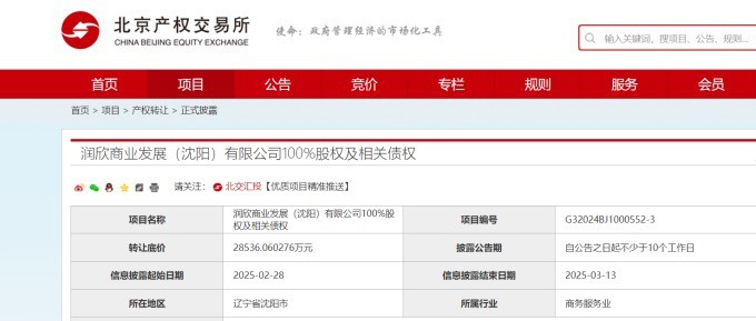 3月3日,據(jù)北京產(chǎn)權(quán)交易所,潤(rùn)欣商業(yè)發(fā)展(沈陽(yáng))有限公司100%股權(quán)及相關(guān)債權(quán)掛牌轉(zhuǎn)讓,底價(jià)約28536.06萬(wàn)元。 該標(biāo)的曾于1月13日掛牌轉(zhuǎn)讓,轉(zhuǎn)讓底價(jià)為35670.08萬(wàn)元。 潤(rùn)欣商業(yè)發(fā)展(沈陽(yáng))有限公司成立于2009年6月1日,注冊(cè)資本8.65億元,法定代表人為王先勇。經(jīng)營(yíng)范圍包括商業(yè)管理;自有物業(yè)的出租、經(jīng)營(yíng);自有物業(yè)的管理和停車場(chǎng)的經(jīng)營(yíng)管理等,該公司由Runxin Yinkou (HK) Co. Limited持股100%。據(jù)公告,轉(zhuǎn)讓方Runxin Yinkou (HK) Co. Limited屬于華潤(rùn)(集團(tuán))有限公司旗下公司。 |