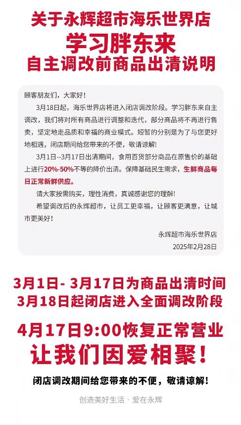 《職業(yè)零售網(wǎng)》獲悉,永輝超市海樂(lè)世界店發(fā)布了《學(xué)習(xí)胖東來(lái)自主調(diào)改前商品出清說(shuō)明》,宣布即將啟動(dòng)學(xué)習(xí)胖東來(lái)調(diào)改,并計(jì)劃于4月17日恢復(fù)營(yíng)業(yè)。這也是永輝超市在昆明首家學(xué)習(xí)胖東來(lái)調(diào)改的門店。 據(jù)該說(shuō)明透露,永輝超市海樂(lè)世界店將于3月18日起進(jìn)入閉店調(diào)改階段,期間將對(duì)所有商品進(jìn)行調(diào)整和迭代,部分商品將不再售賣。具體而言,3月1日至17日為商品出清時(shí)間,部分商品將在原售價(jià)的基礎(chǔ)上進(jìn)行20%-50%不等的降價(jià)處理。 據(jù)該店客服回應(yīng)媒體表示,調(diào)改后,超市的布局會(huì)有一定變化,還將上架一些胖東來(lái)的商品。 值得一提的是,2025年初,永輝超市宣布了堅(jiān)定推進(jìn)“胖東來(lái)模式調(diào)改”的戰(zhàn)略決策。日前,永輝超市已發(fā)布了首批全國(guó)調(diào)改門店名單,涉及15個(gè)城市的20家門店。截至目前,永輝超市已在全國(guó)18個(gè)城市的41家門店完成了調(diào)改升級(jí)。 |
