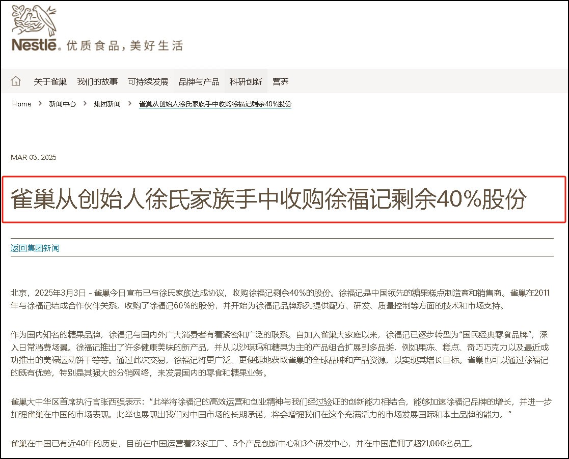 14年前,雀巢以戰(zhàn)略眼光控股徐福記60%,拉開合作帷幕;時(shí)光推移,如今成功收購余下股份,徐福記正式步入雀巢全資控股新時(shí)代。 3月3日,雀巢集團(tuán)在官網(wǎng)發(fā)布消息,宣布已與徐氏家族達(dá)成協(xié)議,收購徐福記剩余40%的股份,但未透露具體交易金額。此次交易完成后,雀巢將實(shí)現(xiàn)對(duì)徐福記全資持股。 圖來源:雀巢官網(wǎng)。 官網(wǎng)顯示,徐福記是中國(guó)領(lǐng)先的糖果糕點(diǎn)制造商和銷售商,1992年由來自中國(guó)臺(tái)灣的徐氏四兄弟創(chuàng)立,主要生產(chǎn)基地位于廣東東莞。 2011年,雀巢與徐福記結(jié)成合作伙伴關(guān)系,以17億美元的價(jià)格收購了徐福記60%的股份,成為其控股股東,并開始為徐福記品牌系列提供配方、研發(fā)、質(zhì)量控制等方面的技術(shù)和市場(chǎng)支持。 雀巢中國(guó)在官網(wǎng)上介紹,自加入雀巢大家庭以來,徐福記已逐步轉(zhuǎn)型為“國(guó)民經(jīng)典零食品牌”,深入日常消費(fèi)場(chǎng)景。徐福記推出了許多健康美味的新產(chǎn)品,并從以沙琪瑪和糖果為主的產(chǎn)品組合擴(kuò)展到多品類,例如果凍、糕點(diǎn)、奇巧巧克力以及最近成功推出的美祿運(yùn)動(dòng)餅干等等。 雀巢方面表示,通過此次交易,徐福記將更廣泛、更便捷地獲取雀巢的全球品牌和產(chǎn)品資源,以實(shí)現(xiàn)其增長(zhǎng)目標(biāo)。雀巢也可以通過徐福記的既有優(yōu)勢(shì),特別是其強(qiáng)大的分銷網(wǎng)絡(luò),來發(fā)展國(guó)內(nèi)的零食和糖果業(yè)務(wù)。 據(jù)悉,目前在雀巢中國(guó)的業(yè)務(wù)版圖中,徐福記和糖果業(yè)務(wù)是兩個(gè)獨(dú)立的業(yè)務(wù)單元,市場(chǎng)上有種猜測(cè)認(rèn)為,未來徐福記和糖果業(yè)務(wù)或融合為一個(gè)業(yè)務(wù)單元,但該說法未獲得雀巢中國(guó)的確認(rèn)。雀巢中國(guó)稱,“我們將尋找方法為兩個(gè)業(yè)務(wù)都帶來最佳增長(zhǎng)”。 今年2月,雀巢發(fā)布2024年業(yè)績(jī)顯示,該集團(tuán)銷售額為914億瑞士法郎(折合人民幣約7467億元),有機(jī)增長(zhǎng)率達(dá)到2.2%;在大中華大區(qū),雀巢銷售額為50億瑞士法郎(約合人民幣403億元),同比有機(jī)增長(zhǎng)率為2.1%。 不僅從集團(tuán)整體業(yè)績(jī)層面來看,咖啡、糖果和寵物護(hù)理業(yè)務(wù)對(duì)集團(tuán)增長(zhǎng)貢獻(xiàn)顯著,而且聚焦到大中華大區(qū),嬰兒營(yíng)養(yǎng)和糖果業(yè)務(wù)同樣表現(xiàn)出色。另據(jù)雀巢中國(guó)官網(wǎng)披露,在大中華大區(qū),2024年雀巢嬰兒營(yíng)養(yǎng)和糖果業(yè)務(wù)取得了市場(chǎng)份額的增長(zhǎng),在徐福記和脆脆鯊的穩(wěn)健增長(zhǎng)以及新品上市和電商增長(zhǎng)的推動(dòng)下,糖果業(yè)務(wù)實(shí)現(xiàn)了中個(gè)位數(shù)的增長(zhǎng) 。 除了整體業(yè)績(jī)數(shù)據(jù)亮眼,市場(chǎng)研究數(shù)據(jù)也從側(cè)面展現(xiàn)了徐福記的強(qiáng)勁實(shí)力。尼爾森零售研究數(shù)據(jù)顯示,在2024年的大賣場(chǎng)超市渠道,徐福記散裝糖、散裝巧克力、散裝糕點(diǎn)三大品類位居市場(chǎng)第一,散裝果凍位居第二,其中散裝糖、散裝巧克力的市場(chǎng)占有率均超過30%。這些數(shù)據(jù)充分展現(xiàn)了徐福記在糖果糕點(diǎn)領(lǐng)域強(qiáng)大的市場(chǎng)競(jìng)爭(zhēng)力,也為雀巢在華糖果業(yè)務(wù)的發(fā)展提供了有力支撐。 財(cái)報(bào)顯示,盡管大中華大區(qū)消費(fèi)需求疲軟,且在多個(gè)品類均面臨激烈的價(jià)格競(jìng)爭(zhēng),大中華大區(qū)每個(gè)季度的實(shí)際內(nèi)部增長(zhǎng)率均為正值,這得益于在關(guān)鍵品類中推動(dòng)更快的創(chuàng)新,并調(diào)整深度分銷和渠道策略,以捕捉新的增長(zhǎng)機(jī)會(huì)。 2024年3月,徐福記總裁劉興罡曾在2024年新品戰(zhàn)略發(fā)布會(huì)上表示,徐福記已經(jīng)連續(xù)4年實(shí)現(xiàn)高位增長(zhǎng),整體營(yíng)收規(guī)模已超過70億元。他還稱,期望徐福記銷售規(guī)模在2027年能達(dá)到百億元。 雀巢大中華區(qū)首席執(zhí)行官張西強(qiáng)于今年2月公開表示,2024年雀巢中國(guó)在渠道建設(shè)上投入大量精力,這成為推動(dòng)業(yè)績(jī)?cè)鲩L(zhǎng)的關(guān)鍵因素之一。其中,徐福記發(fā)揮了重要作用,其 2024 年產(chǎn)品分銷覆蓋達(dá)200萬個(gè)網(wǎng)點(diǎn),且2025年目標(biāo)提升至260萬個(gè)。不僅如此,徐福記產(chǎn)品 “出! 表現(xiàn)出色。 張西強(qiáng)還指出,此次雀巢全資收購徐福記意義重大,將徐福記的高效運(yùn)營(yíng)與創(chuàng)業(yè)精神,和雀巢經(jīng)過驗(yàn)證的創(chuàng)新能力深度融合,不僅能夠加速徐福記品牌的增長(zhǎng),進(jìn)一步強(qiáng)化雀巢在中國(guó)市場(chǎng)的表現(xiàn),更展現(xiàn)出雀巢對(duì)中國(guó)市場(chǎng)的長(zhǎng)期承諾,有助于增強(qiáng)在這個(gè)充滿活力的市場(chǎng)發(fā)展國(guó)際和本土品牌的能力。 徐福記官網(wǎng)介紹,徐福記在全國(guó)擁有8大分部、58個(gè)大區(qū)、超過3500家經(jīng)銷商,服務(wù)超過200萬家終端門店,從都市到鄉(xiāng)村,強(qiáng)大銷售網(wǎng)絡(luò)覆蓋全國(guó),并遠(yuǎn)銷海外。如此強(qiáng)大的銷售網(wǎng)絡(luò),不僅為徐福記自身發(fā)展奠定了