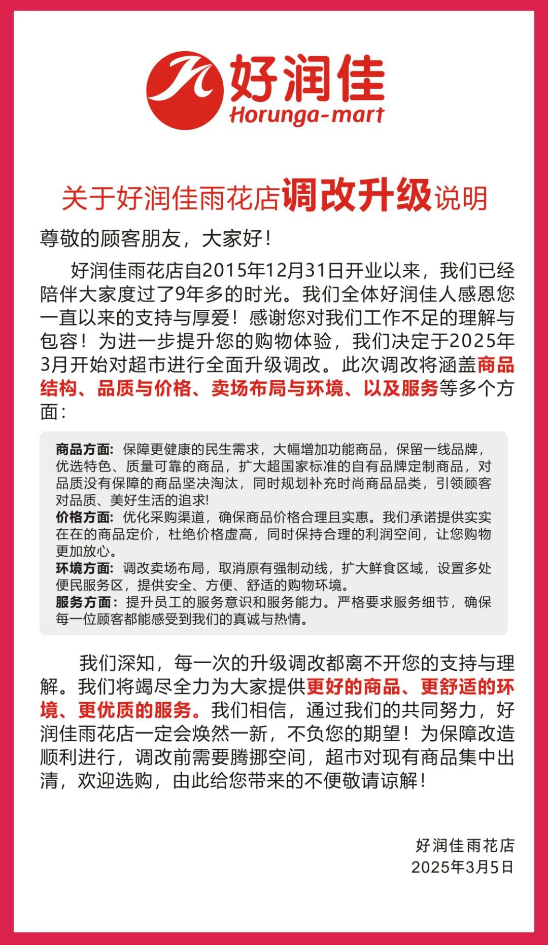 《職業(yè)零售網(wǎng)》獲悉,3月5日,湖南豐彩投資有限公司旗下好潤佳雨花店宣布,將于2025年3月7日啟動全面升級調(diào)改計劃,旨在為消費者提供更優(yōu)質(zhì)、更舒適的購物體驗。這也是繼橋南店和財富店之后,好潤佳再次啟動的調(diào)改計劃。 在商品結(jié)構(gòu)方面,門店將大幅增加功能商品,保留一線品牌,并引入更多特色、質(zhì)量可靠的商品。同時,還將擴大自有品牌定制商品的范圍,淘汰品質(zhì)無保障的商品,確保消費者能夠購買到更高品質(zhì)的商品。 在價格方面,好潤佳將優(yōu)化采購渠道,確保商品價格合理且實惠。好潤佳承諾提供實實在在的商品定價,杜絕價格虛高,同時保持合理的利潤空間,讓消費者購物更加放心。 在購物環(huán)境方面,門店將調(diào)改賣場布局,取消原有強制動線,擴大鮮食區(qū)域,并設(shè)置多處便民服務(wù)區(qū)。通道寬度將從原有的1米擴展至3-4米,使購物空間更加寬敞、舒適。 在服務(wù)質(zhì)量方面,門店將提升員工的服務(wù)意識和服務(wù)能力,嚴(yán)格要求服務(wù)細(xì)節(jié)。新增40項服務(wù)內(nèi)容,包括水果區(qū)免費去皮切塊裝盒、冷凍品提供冰袋、免費禮品打包、滿額免費停車以及免費上門水電維修等,致力于打造便民的、像家一樣的購物環(huán)境。 官網(wǎng)資料顯示,好潤佳隸屬于湖南豐彩實業(yè)發(fā)展有限公司旗下品牌,成立于1998年,總部位于長沙。目前,好潤佳擁有超過21家大型連鎖超市,這些門店遍布長沙、常德、益陽、岳陽、張家界、吉首六個地州市。此外,公司還配備兩個專業(yè)的物流配送中心,并下轄一家四星級商務(wù)酒店和一家房地產(chǎn)開發(fā)公司。 此前,好潤佳橋南店和財富店經(jīng)過精心調(diào)改升級后,已以全新面貌迎接顧客。調(diào)整內(nèi)容包括優(yōu)化購物環(huán)境、更新商品體系、提升服務(wù)質(zhì)量等,獲得了消費者的廣泛好評。 好潤佳雨花店此次調(diào)改升級,將借鑒橋南店的成功經(jīng)驗,全方位優(yōu)化購物體驗。好潤佳方面表示,此次升級不僅是對門店硬件設(shè)施的改造,更是對服務(wù)理念和服務(wù)質(zhì)量的全面提升。希望通過調(diào)改,能為消費者帶來更優(yōu)質(zhì)、更便捷的購物體驗。 對于好潤佳雨花店后續(xù)調(diào)改的進展,《職業(yè)零售網(wǎng)》將持續(xù)關(guān)注。 |