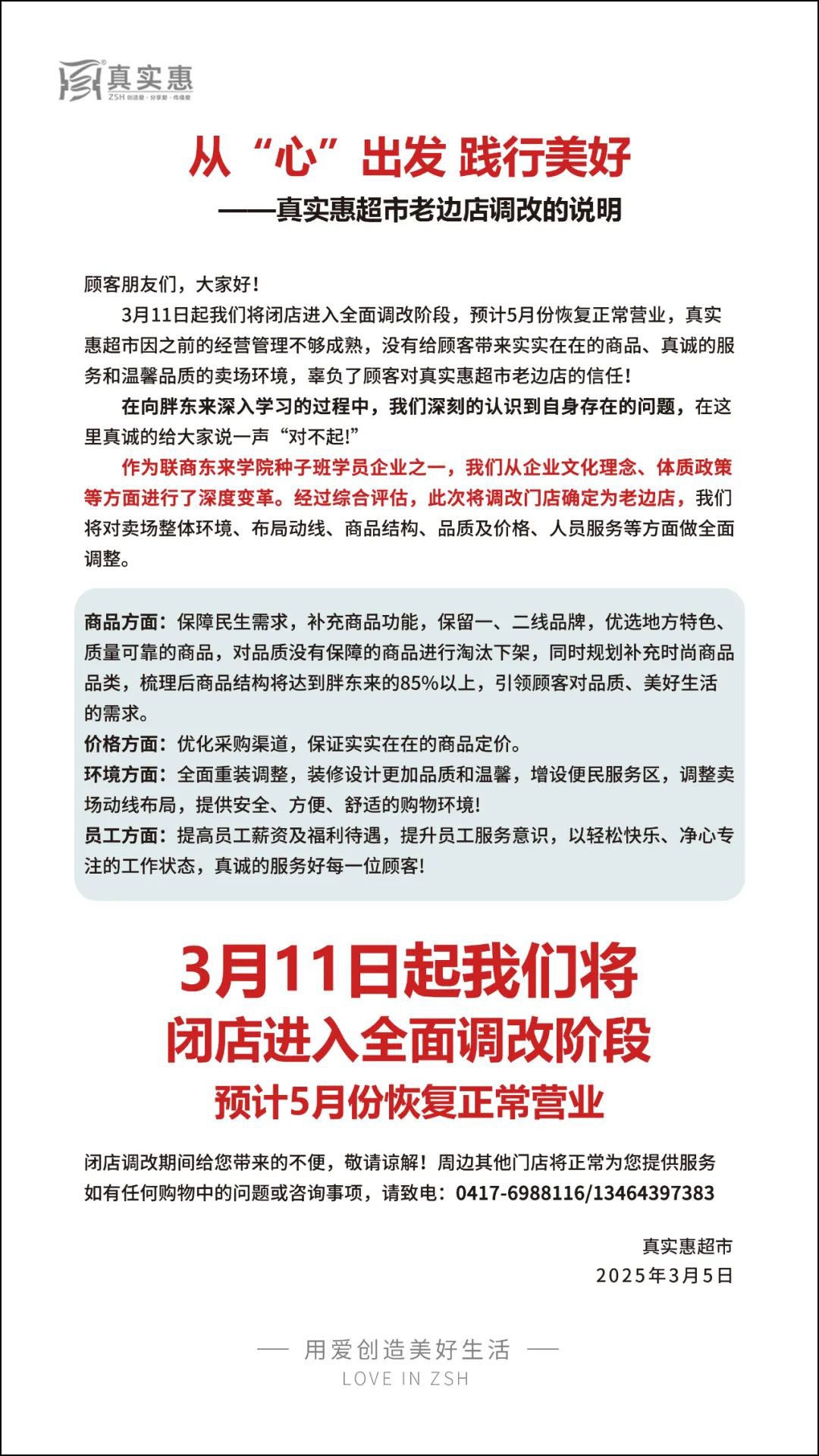 《職業(yè)零售網(wǎng)》獲悉,3月5日,真實(shí)惠超市老邊店發(fā)布了調(diào)改說(shuō)明。該店將從3月11日起正式進(jìn)入全面調(diào)改階段,預(yù)計(jì)5月份恢復(fù)正常營(yíng)業(yè)。 作為聯(lián)商?hào)|來(lái)學(xué)院種子班學(xué)員企業(yè)之一,真實(shí)惠超市從企業(yè)文化理念、體制政策等方面進(jìn)行了深度變革。經(jīng)過(guò)綜合評(píng)估,此次調(diào)改門店確定為老邊店,將對(duì)賣場(chǎng)整體環(huán)境、布局動(dòng)線、商品結(jié)構(gòu)、品質(zhì)及價(jià)格、人員服務(wù)等方面進(jìn)行全面調(diào)整。 商品方面:保障民生需求,補(bǔ)充商品功能,保留一、二線品牌,優(yōu)選地方特色、質(zhì)量可靠的商品,淘汰品質(zhì)不達(dá)標(biāo)的產(chǎn)品,同時(shí)規(guī)劃補(bǔ)充時(shí)尚商品品類。調(diào)整后的商品結(jié)構(gòu)將達(dá)到胖東來(lái)的85%以上,引領(lǐng)顧客對(duì)品質(zhì)和美好生活的需求。 價(jià)格方面:優(yōu)化采購(gòu)渠道,確保商品定價(jià)實(shí)惠,為顧客提供實(shí)實(shí)在在的商品。 環(huán)境方面:全面重裝調(diào)整,提升裝修品質(zhì),營(yíng)造溫馨舒適的購(gòu)物環(huán)境。增設(shè)便民服務(wù)區(qū),調(diào)整賣場(chǎng)動(dòng)線布局,提供安全、方便、舒適的購(gòu)物體驗(yàn)。 員工方面:提高員工薪資及福利待遇,提升員工服務(wù)意識(shí),以輕松快樂、專注的工作狀態(tài),真誠(chéng)服務(wù)每一位顧客。 此次調(diào)改是真實(shí)惠超市在學(xué)習(xí)胖東來(lái)先進(jìn)經(jīng)驗(yàn)的基礎(chǔ)上,對(duì)自身經(jīng)營(yíng)管理和服務(wù)品質(zhì)的一次全面提升。通過(guò)這次調(diào)改,真實(shí)惠超市希望在商品品質(zhì)、價(jià)格實(shí)惠、購(gòu)物環(huán)境和服務(wù)水平等方面實(shí)現(xiàn)全面升級(jí),為顧客帶來(lái)全新的購(gòu)物體驗(yàn)。 |