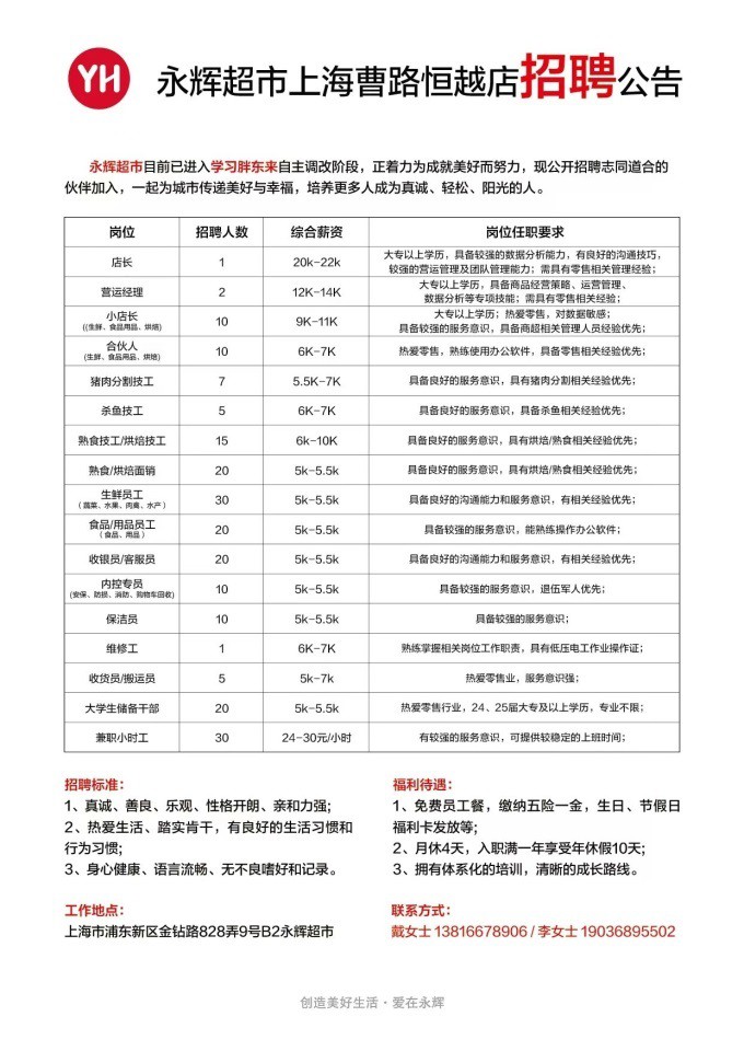 3月11日,上海永輝超市宣布,永輝上海第三家學(xué)習(xí)胖東來自主調(diào)改店——曹路恒越店招聘開啟,并將于3月13-23日清倉。 公告顯示,此次招聘的崗位包括店長、運(yùn)營經(jīng)理、小店長、合伙人、豬肉分割技工、熟食技工等17個(gè)崗位,崗位薪資最低5千元起。 福利待遇包含免費(fèi)員工餐,繳納五險(xiǎn)一金,生日、節(jié)假日福利卡發(fā)放等;月休4天,入職滿一年享受年休假10天;擁有體系化的培訓(xùn),清晰的成長路線。 永輝超市稱,目前已進(jìn)入學(xué)習(xí)胖東來自主調(diào)改階段,正著力為成就美好而努力,現(xiàn)公開招聘志同道合的伙伴加入,一起為城市傳遞美好與幸福,培養(yǎng)更多人成為真誠、輕松、陽光的人。 |