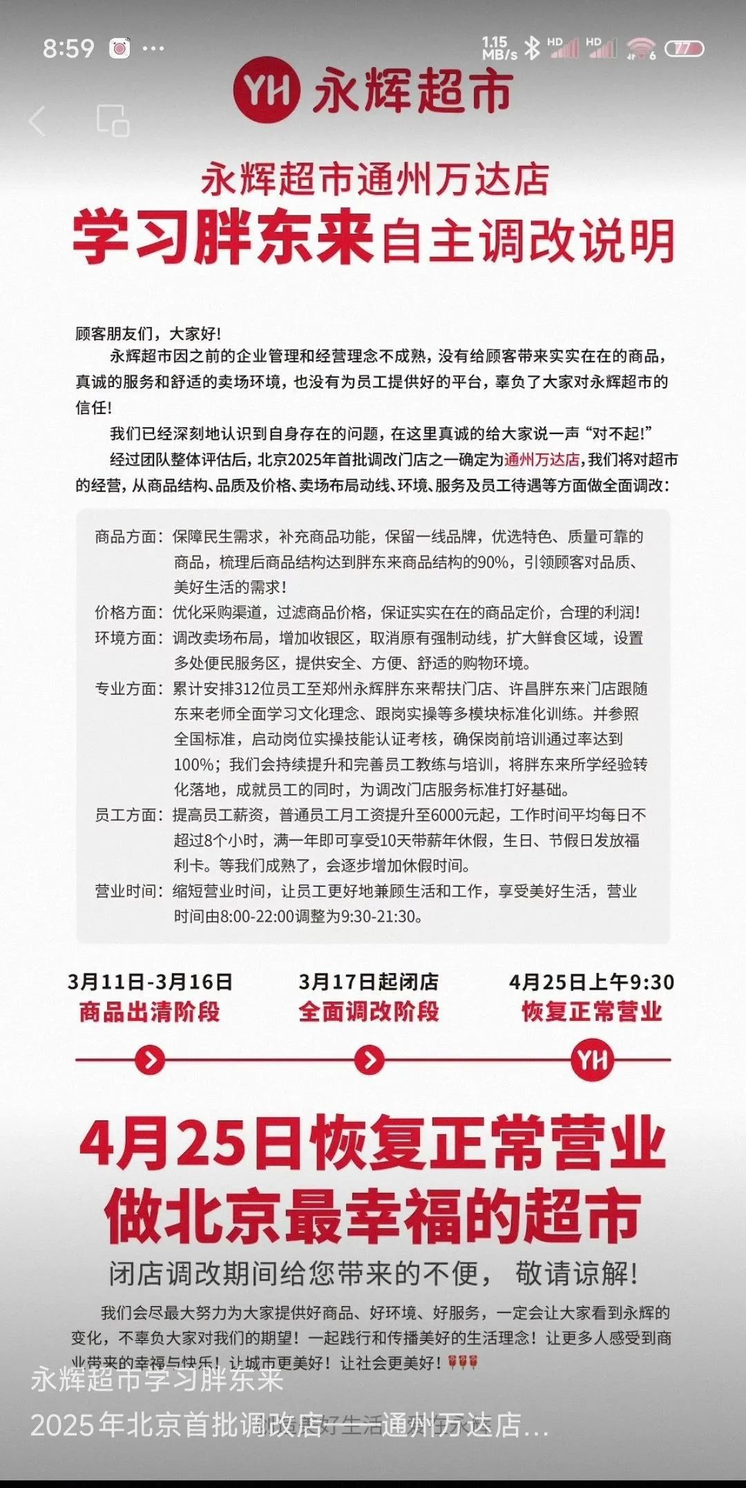 《職業(yè)零售網(wǎng)》獲悉,永輝超市通州萬達(dá)店宣布,將于3月17日起閉店進(jìn)行升級改造。 此前,根據(jù)永輝超市官方發(fā)布的消息,閉店期間,永輝將對超市的經(jīng)營,從商品結(jié)構(gòu)、品質(zhì)及價(jià)格、賣場布局動(dòng)線、環(huán)境、服務(wù)及員工待遇等方面做全面調(diào)改。 在商品方面,以保障民生需求,補(bǔ)充商品功能,保留一線品牌,優(yōu)選特色、質(zhì)量可靠的商品,梳理后商品結(jié)構(gòu)達(dá)到胖東來商品結(jié)構(gòu)的90%。 在價(jià)格方面,通過優(yōu)化采購渠道,過濾商品價(jià)格,保證實(shí)實(shí)在在的商品定價(jià)、合理的利潤。 在環(huán)境方面,將調(diào)改賣場布局,增加收銀區(qū),取消原有強(qiáng)制動(dòng)線,擴(kuò)大鮮食區(qū)域,設(shè)置多處便民服務(wù)區(qū),提供安全、方便、舒適的購物環(huán)境。 在員工關(guān)懷層面,超市決定縮短營業(yè)時(shí)間,讓員工更好地兼顧生活和工作,享受美好生活,營業(yè)時(shí)間由8:00-22:00調(diào)整為9:30-21:30。這一調(diào)整旨在讓員工能夠更好地平衡工作與生活,擁有更多時(shí)間享受美好生活,從而以更飽滿的熱情投入到后續(xù)的工作中。 值得注意的是,超市工作人員透露,3月11日到3月16日處于商品出清階段,目前超市內(nèi)部分商品已開始打折出清。待全面調(diào)改完成后,預(yù)計(jì)4月25日恢復(fù)正常營業(yè)。以全新的面貌迎接廣大顧客。 |