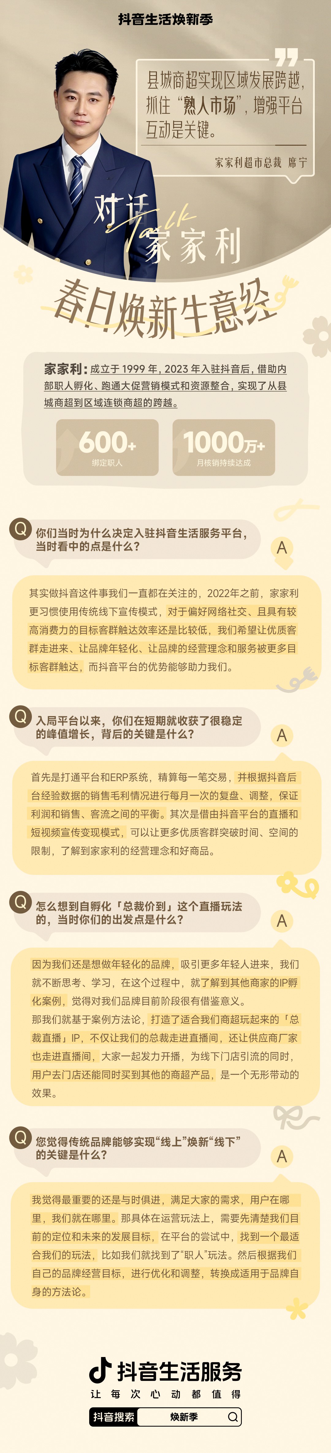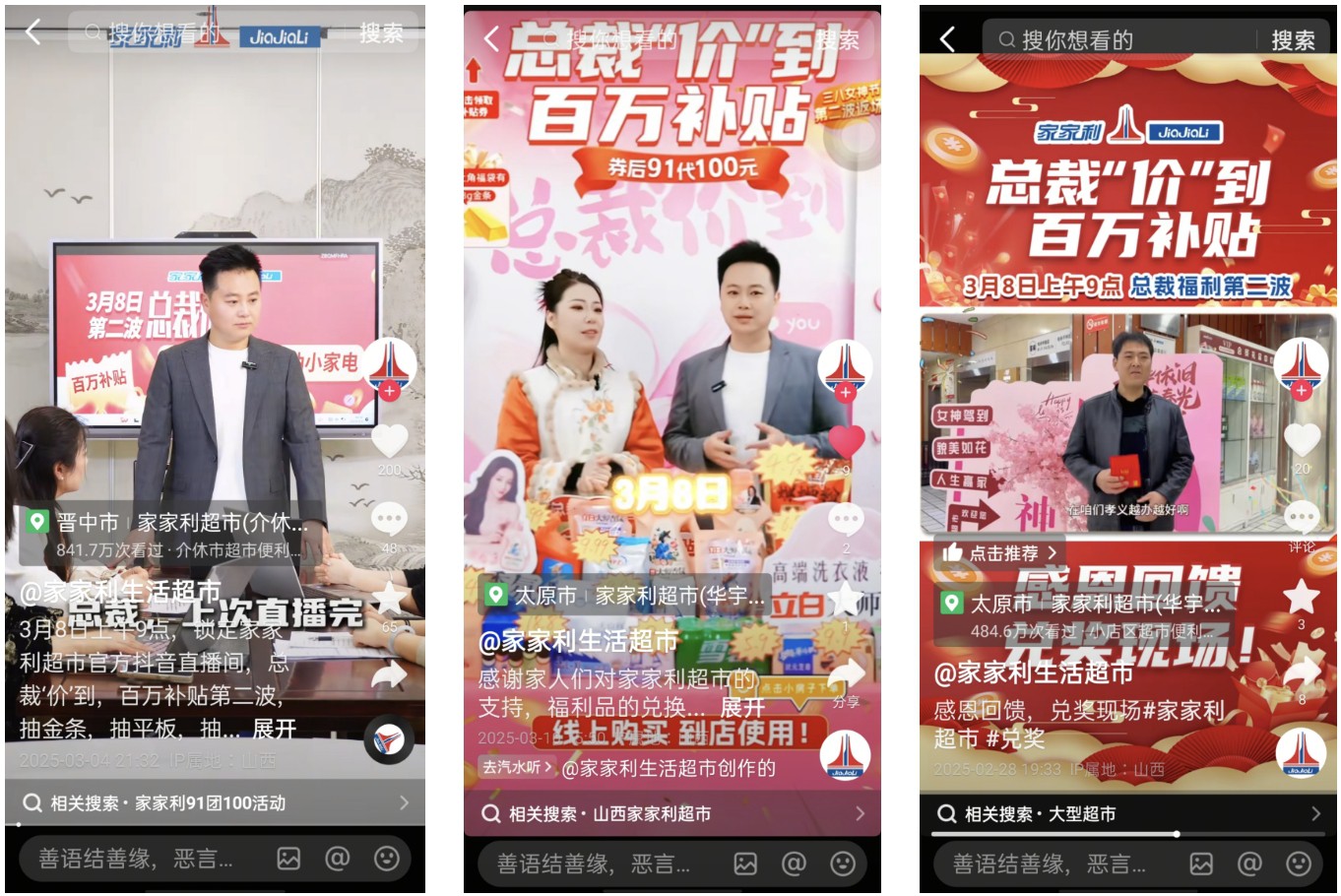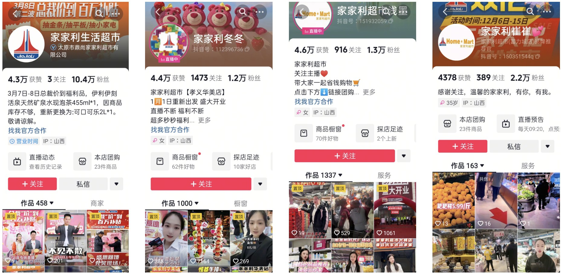 每天下午16點(diǎn),是白領(lǐng)家庭主婦林悅逛超市的時(shí)間。 提前在抖音直播間團(tuán)好大額商超代金券,成為她開逛前的關(guān)鍵一步。 不止林悅,在抖音搜索“超市購(gòu)物”,話題討論熱度超87.7億次,許多人通過抖音分享看到的商超優(yōu)惠、好品上新、以及用券攻略...... 大眾行為動(dòng)向的背后,往往投射出一個(gè)行業(yè)的趨勢(shì)變化。2025年伊始,中國(guó)連鎖經(jīng)營(yíng)協(xié)會(huì)對(duì)2024年連鎖超市的經(jīng)營(yíng)情況進(jìn)行了摸底調(diào)查。在線上銷售方面,超市線上業(yè)務(wù)相較于總銷售同比表現(xiàn)較好。48.9%的超市企業(yè)線上銷售同比增長(zhǎng),其中集中在二、三線市場(chǎng)正在轉(zhuǎn)型的超市企業(yè)中,30%的企業(yè)仍保持20%以上的高增長(zhǎng)。 零售商超線上化的趨勢(shì)中,不少?gòu)闹修D(zhuǎn)型成長(zhǎng)起來的商家,已經(jīng)找到了新的增長(zhǎng)路徑,家家利便是其中一個(gè)。截止到目前,家家利已經(jīng)成功拓店31家,團(tuán)購(gòu)訂單增長(zhǎng)穩(wěn)定,月核銷持續(xù)達(dá)1000萬+。 “商超線上線下體驗(yàn)融合”的趨勢(shì)正熱,為什么一個(gè)從縣城本土成長(zhǎng)起來的家家利能夠“殺出重圍”,實(shí)現(xiàn)持續(xù)、穩(wěn)定的生意和拓店增長(zhǎng)? 當(dāng)一個(gè)縣城商超決定做抖音 作為連鎖零售品牌,家家利從1999年成立起,就深深扎根于山西這片土地。 從第一家商超到現(xiàn)在多地區(qū)連鎖門店擴(kuò)張,從傳統(tǒng)線下到線上浪潮的成功轉(zhuǎn)型經(jīng)營(yíng),家家利的探索并非一帆風(fēng)順,經(jīng)歷了4個(gè)煥新迭代周期,在不斷的探索和試錯(cuò)中,找到了最適合品牌本身定位的那條路。 2022年之前,家家利更習(xí)慣使用紙質(zhì)海報(bào)、宣傳車、電梯廣告等傳統(tǒng)線下宣傳模式,對(duì)于偏好網(wǎng)絡(luò)社交、且具有較高消費(fèi)力的目標(biāo)客群:封閉式小區(qū)居民、雙薪家庭、早出晚歸的白領(lǐng)、不便出門的寶媽等,缺乏低成本有效率的觸達(dá)渠道,造成營(yíng)銷費(fèi)用不斷增加,但客流的含金量一直偏低的情況。 對(duì)于超市門店經(jīng)營(yíng)來說,優(yōu)質(zhì)、年輕客群的增長(zhǎng)和門店的生命線呈正相關(guān),具體表現(xiàn)在家家利的生意經(jīng)營(yíng)上,讓優(yōu)質(zhì)客群走進(jìn)來、讓品牌年輕化、讓品牌的經(jīng)營(yíng)理念和服務(wù)被更多目標(biāo)客群觸達(dá)、接受,是主要訴求,也是破局的出口。彼時(shí),用戶日活超6億、興趣精準(zhǔn)推薦的抖音平臺(tái),讓家家利看到了新的探索方向。 “把平臺(tái)上的玩法都試一遍,才能找到適合自己的玩法......”,家家利超市總裁席寧回憶當(dāng)時(shí)的決策時(shí)說到。初期的家家利屬于掃盲狀態(tài),各種玩法摸索過程中,孝義門店店員拍攝一條草莓塔短視頻在抖音上獲得了百萬曝光,驚喜之外,也堅(jiān)定了家家利重倉(cāng)投入抖音、建立線上團(tuán)隊(duì)和打造門店短視頻宣傳矩陣的信心,并同步開啟了抖音引流、進(jìn)店轉(zhuǎn)化的營(yíng)銷模式。 正式入局抖音生活服務(wù)平臺(tái)后,家家利通過“打造職人矩陣”、“精準(zhǔn)數(shù)據(jù)分析”、“整合廠家資源”三個(gè)玩法策略,實(shí)現(xiàn)了大促期間銷售客流雙增長(zhǎng)、全年宣傳費(fèi)用降低30%、提升優(yōu)質(zhì)客群銷售占比的好成績(jī)。 抖音職人玩出花,素人員工當(dāng)主播月帶貨百萬 在縣城,員工比網(wǎng)紅更會(huì)宣傳、更能帶貨? 30歲的店員主播職人,抖音賬號(hào)月帶貨200萬,提成超原工資3倍,這不是什么天方夜譚,而是在家家利上演的真實(shí)一幕。 在過去,“職人”的釋義多是手藝人、匠人;流量時(shí)代下,抖音生活服務(wù)平臺(tái)賦予了“職人”更多的經(jīng)營(yíng)意義,讓最熟悉門店產(chǎn)品的店員出鏡,作為短視頻的和直播的主角,在官方或者新孵化的賬號(hào),完成品牌內(nèi)容的輸出。 起初,家家利也是摸著石頭過河,嘗試各種抖音線上玩法。偶然間,他們發(fā)現(xiàn)利用縣城的“熟人圈”,發(fā)揮抖音職人的天然宣傳效果,1個(gè)抖音職人能影響100個(gè)親友,百人團(tuán)隊(duì)即可覆蓋縣城1/3家庭。于是,家家利發(fā)動(dòng)店員們嘗試開抖音直播、做短視頻,沒想到效果出奇地好。 家家利超市店員的抖音賬號(hào)(部分) “這樣的例子有很多,也帶給我們很多驚喜,霍州門店的55歲生鮮主管王姐是標(biāo)桿,她用方言拍攝的'挑西瓜三部曲'視頻,吸引了不少親戚熟客到店,還有45歲的日化促銷員李姐,更是我們抖音職人活動(dòng)的明星店員,帶貨力很強(qiáng),還被我們戲稱為超市版張?zhí)m......”,席總分享道,在縣城這個(gè)熟人社會(huì)里,員工天然的人脈網(wǎng)比官方賬號(hào)更有滲透力。而且當(dāng)顧客發(fā)現(xiàn)主播是認(rèn)識(shí)的親戚好友時(shí),信任感、轉(zhuǎn)化率自然就產(chǎn)生了。 于是,一場(chǎng)旨在強(qiáng)化抖音職人體系、利用人情紐帶的經(jīng)營(yíng)“革新”,在家家利悄然掀起。 抖音職人帶來的效果顯著,但為了迅速?gòu)?fù)制明星職人的效果到所有門店,家家利通過日激勵(lì)、周評(píng)比、月培訓(xùn)、樹標(biāo)竿的方式,動(dòng)員所有門店開展職人宣傳矩陣和一店一播,并在門店設(