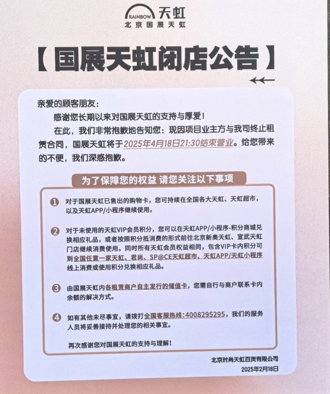根據(jù)《北京日?qǐng)?bào)》消息,北京國(guó)展天虹將于4月18日21:30分結(jié)束營(yíng)業(yè)后閉店。國(guó)展天虹在公告中表示,閉店是因?yàn)轫?xiàng)目業(yè)主方終止租賃合同。 公開(kāi)資料顯示:國(guó)展天虹于2010年開(kāi)業(yè),項(xiàng)目面積2萬(wàn)平方米,是天虹在北京的第二家商場(chǎng),至今已經(jīng)運(yùn)營(yíng)15年。 根據(jù)天虹2024年財(cái)報(bào),截至2024年12月31日,天虹在北京合計(jì)擁有3家門(mén)店。 財(cái)報(bào)顯示:2024年天虹北京3家門(mén)店實(shí)現(xiàn)營(yíng)業(yè)收入2.37億元,同比增長(zhǎng)4.63%;利潤(rùn)總額同比增長(zhǎng)98.26%;客流同比增長(zhǎng)10.62%。 隨著國(guó)展天虹關(guān)閉,天虹在北京僅剩2家門(mén)店,分別是北京宣武天虹和北京新奧天虹,前者是天虹在北京首店,于2009年4月開(kāi)業(yè)。后者則于2012年1月開(kāi)業(yè)。 根據(jù)天虹最新財(cái)報(bào),2024年天虹實(shí)現(xiàn)營(yíng)業(yè)收入117.86億元,同比下降2.49%;歸屬于上市公司股東的凈利潤(rùn)7671.74萬(wàn)元,同比下降66.16%;實(shí)現(xiàn)銷售額358億元,同比下降1.8%。 |