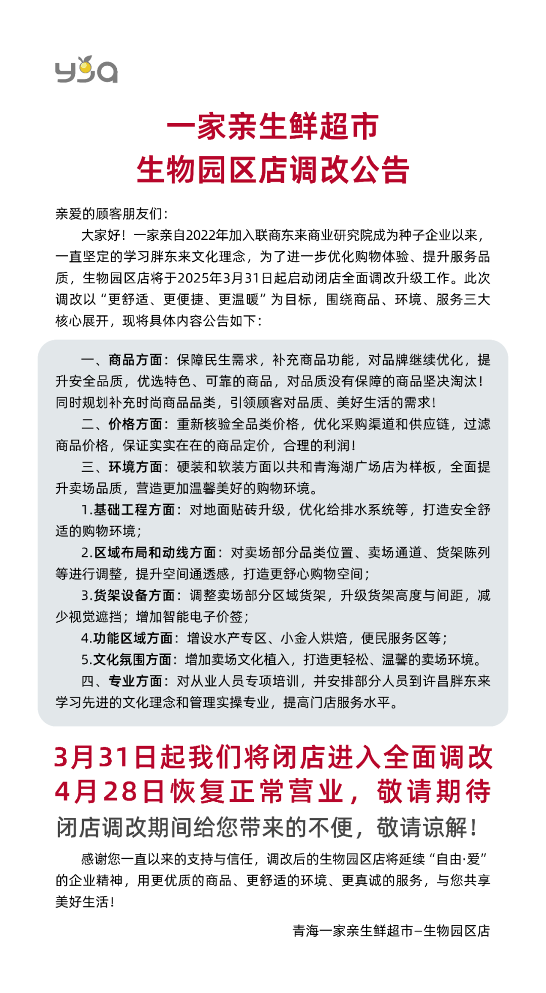 《職業(yè)零售網(wǎng)》獲悉,3月27日,青海一家親生鮮超市生物園區(qū)店發(fā)布《閉店調(diào)改公告》稱,將于3月31日起啟動(dòng)閉店閉店調(diào)改,預(yù)計(jì)4月28日恢復(fù)正常營(yíng)業(yè)。此次調(diào)改旨在進(jìn)一步優(yōu)化購(gòu)物體驗(yàn)、提升服務(wù)品質(zhì),以“更舒適、更便捷、更溫暖”為目標(biāo),圍繞商品、價(jià)格、環(huán)境、專業(yè)四大核心展開。 商品升級(jí):保障民生需求,優(yōu)化品牌選擇,提升商品安全品質(zhì),淘汰無保障商品,補(bǔ)充時(shí)尚品類,滿足顧客對(duì)品質(zhì)生活的追求。 價(jià)格優(yōu)化:重新核驗(yàn)全品類價(jià)格,優(yōu)化采購(gòu)渠道和供應(yīng)鏈,確保商品定價(jià)實(shí)在合理。 環(huán)境提升:以共和青海湖廣場(chǎng)店為樣板,全面提升賣場(chǎng)品質(zhì),包括地面貼磚升級(jí)、優(yōu)化給排水系統(tǒng)、調(diào)整區(qū)域布局、升級(jí)貨架設(shè)備、增設(shè)功能區(qū)域、增強(qiáng)文化氛圍等,營(yíng)造溫馨美好的購(gòu)物環(huán)境。 專業(yè)服務(wù):對(duì)從業(yè)人員進(jìn)行專項(xiàng)培訓(xùn),并安排部分人員到許昌胖東來學(xué)習(xí)先進(jìn)理念和管理經(jīng)驗(yàn),提升服務(wù)水平。 一家親生鮮超市表示,調(diào)改后的生物園區(qū)店將延續(xù)“自由·愛”的企業(yè)精神,為顧客提供更優(yōu)質(zhì)的商品、更舒適的環(huán)境和更真誠(chéng)的服務(wù)。 |