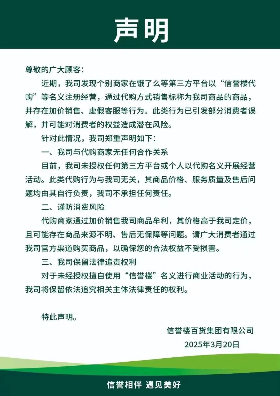 3月26日消息,3月20日,信譽樓百貨集團有限公司發(fā)布鄭重聲明,針對近期個別商家在餓了么等第三方平臺以“信譽樓代購”名義注冊經營的行為進行澄清。聲明指出,此類代購行為與信譽樓百貨集團無任何合作關系,且存在加價銷售、虛假客服等問題,可能對消費者權益造成潛在風險。 |