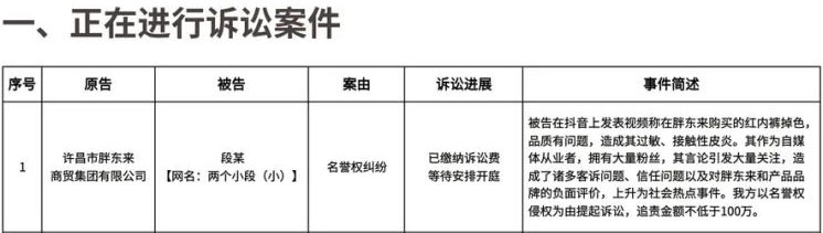 4月5日,胖東來商貿(mào)集團發(fā)布《胖東來關(guān)于侵權(quán)行為的處理公示(五)》。公示內(nèi)容顯示,此前發(fā)視頻稱“胖東來紅色內(nèi)褲掉色還過敏”的網(wǎng)紅“兩個小段”被胖東來起訴,追責不低于100萬元。目前,胖東來已繳納訴訟費,案件正在等待安排開庭。 2月4日,博主“兩個小段”在社交媒體發(fā)布視頻稱,自己清洗從胖東來購買的紅色內(nèi)褲發(fā)現(xiàn)掉色,并且在使用后有過敏反應(yīng)。在進行投訴后,她表示胖東來工作人員的處理方式讓人生氣,感到不被尊重。胖東來當日發(fā)文回應(yīng)稱,已組建專項調(diào)查小組并下架涉事品牌系列產(chǎn)品,2月6日,胖東來再次發(fā)文,承認在管理中存在問題并向顧客致歉,同時表示會在調(diào)查結(jié)果出來后第一時間進行公示。 2月14日,胖東來官方抖音號發(fā)布長達53頁的《關(guān)于“紅色內(nèi)褲掉色、過敏以及部門處理過程”的調(diào)查報告》。報告顯示,綜合三家檢測機構(gòu)檢測結(jié)果可以認定,胖東來服裝部銷售的中山市民偉制衣有限公司旗下“富妮來品牌”女士基礎(chǔ)舒適內(nèi)褲為合格商品。 胖東來也承認,由于對企業(yè)文化理念的認知不夠,未按照流程標準為顧客處理與解決,給顧客造成傷害且造成社會負面輿論影響。因此,胖東來對實習(xí)班長予以免職并降學(xué)習(xí)期六個月處理,對值班課長以及客訴處理主管也予以免職處理,連帶處長、店助、店長負有連帶責任給予降一級六個月處理。同時,依據(jù)《胖東來客訴處理標準》,給予顧客發(fā)放500元投訴獎,跟蹤顧客健康恢復(fù)狀況并承擔相關(guān)醫(yī)療費用。 胖東來在報告中指出,顧客在網(wǎng)絡(luò)上表達自身實際使用過程及情緒化的感受,但其在產(chǎn)品未經(jīng)鑒定和鑒定結(jié)果出具前,且醫(yī)院醫(yī)生也無法作出直接因果關(guān)系結(jié)論的情況下,定論產(chǎn)品掉色引起過敏、發(fā)表胖東來所售商品“品質(zhì)有問題”的表述,還在網(wǎng)絡(luò)上傳播誤導(dǎo)性信息,涉嫌嚴重侵犯公司名譽權(quán)。 胖東來在公示中強調(diào),堅決抵制侵權(quán)行為,一旦發(fā)現(xiàn)即會立即取證,并通過法律途徑追究責任,同時持續(xù)公示案件進展。對于任何侵害胖東來公司名譽、商譽等合法權(quán)益的行為,胖東來法務(wù)將堅決依法維權(quán)。綜合評估胖東來品牌價值及社會影響力,對于嚴重侵權(quán)的行為,原則上追責金額不低于100萬元。 據(jù)大象新聞2月28日報道,胖東來創(chuàng)始人于東來回應(yīng)追責“紅內(nèi)褲事件”時表示:“我們希望通過這個事件提醒大家,無論做什么事情,最起碼要有理性,不能隨便放大自己的情緒。希望大家都能勇敢地承擔自己的行為后果,彼此友善、彼此尊重,共同推動社會向更加美好的方向發(fā)展。” |