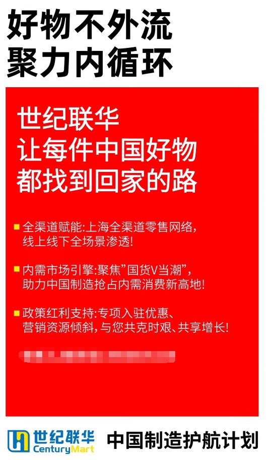 《職業(yè)零售網(wǎng)》獲悉,4月9日,上海世紀聯(lián)華正式宣布啟動《中國制造護航計劃》,推行“好物不外流”,聚力內(nèi)循環(huán),讓每件中國好物都能找到屬于自己的市場。 在渠道方面,世紀聯(lián)華依托其線上線下融合的全渠道零售網(wǎng)絡(luò),為國貨品牌提供全方位銷售渠道,助力好物更便捷地觸達消費者。聚焦內(nèi)需市場,以“國貨 V 當(dāng)潮”為主題,通過特色專區(qū)、促銷活動等形式,助力國貨搶占內(nèi)需消費高地。 此外,在政策方面,提供專項入駐優(yōu)惠和營銷資源傾斜,幫助國貨品牌降低成本、提升曝光度,攜手品牌共克時艱、共享增長。 |