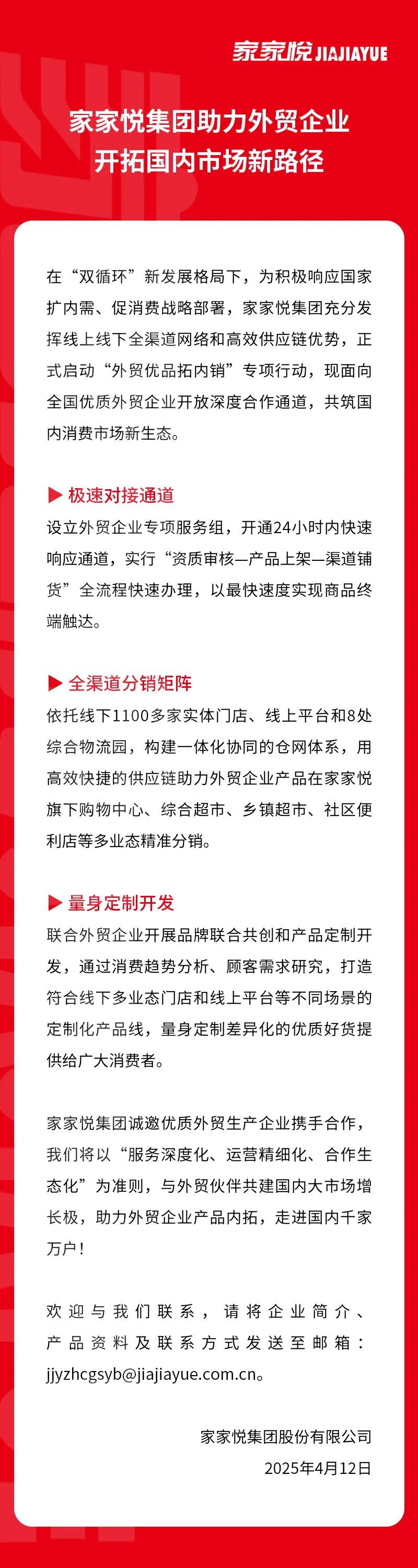 4月12日,家家悅集團(tuán)宣布正式啟動(dòng)“外貿(mào)優(yōu)品拓內(nèi)銷”專項(xiàng)行動(dòng),現(xiàn)面向全國優(yōu)質(zhì)外貿(mào)企業(yè)開放深度合作通道,共筑國內(nèi)消費(fèi)市場新生態(tài)。 1、極速對接通道:設(shè)立外貿(mào)企業(yè)專項(xiàng)服務(wù)組,開通24小時(shí)內(nèi)快速響應(yīng)通道,實(shí)行“資質(zhì)審核-產(chǎn)品上架一渠道鋪貨”全流程快速辦理,以最快速度實(shí)現(xiàn)商品終端觸達(dá)。 2、全渠道分銷矩陣:依托線下1100多家實(shí)體門店、線上平臺和8處綜合物流園,構(gòu)建一體化協(xié)同的倉網(wǎng)體系,用高效快捷的供應(yīng)鏈助力外貿(mào)企業(yè)產(chǎn)品在家家悅旗下購物中心、綜合超市、鄉(xiāng)鎮(zhèn)超市、社區(qū)便利店等多業(yè)態(tài)精準(zhǔn)分銷。 3、量身定制開發(fā):聯(lián)合外貿(mào)企業(yè)開展品牌聯(lián)合共創(chuàng)和產(chǎn)品定制開發(fā),通過消費(fèi)趨勢分析、顧客需求研究,打造符合線下多業(yè)態(tài)門店和線上平臺等不同場景的定制化產(chǎn)品線,量身定制差異化的優(yōu)質(zhì)好貨提供給廣大消費(fèi)者。 |