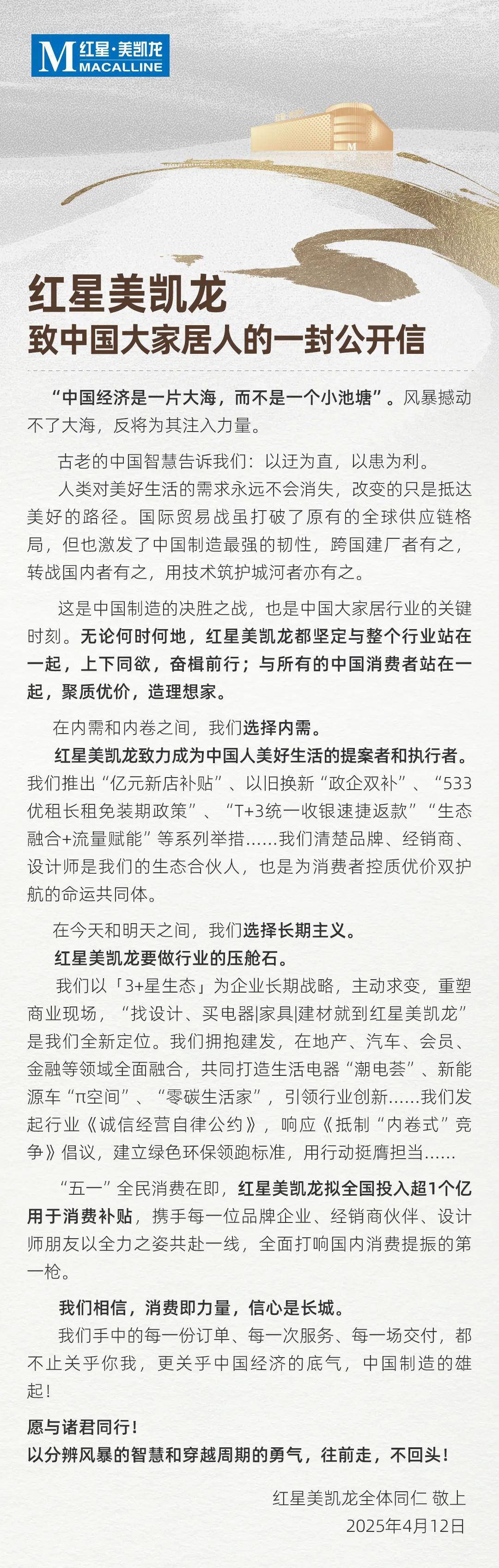 4月12日,紅星美凱龍發(fā)布致中國(guó)大家居人的一份公開(kāi)信。 信中提到,紅星美凱龍致力成為中國(guó)人美好生活的提案者和執(zhí)行者。我們推出“億元新店補(bǔ)貼”、以舊換新“政企雙補(bǔ)”、“533優(yōu)租長(zhǎng)租免裝期政策”、“T+3統(tǒng)一收銀速捷返款”“生態(tài)融合+流量賦能”等系列舉措.….我們清楚品牌、經(jīng)銷(xiāo)商,設(shè)計(jì)師是我們的生態(tài)合伙人,也是為消費(fèi)者控質(zhì)優(yōu)價(jià)雙護(hù)航的命運(yùn)共同體。 此外,“五一”全民消費(fèi)在即,紅星美凱龍擬全國(guó)投入超1個(gè)億用于消費(fèi)補(bǔ)貼,攜手每一位品牌企業(yè)、經(jīng)銷(xiāo)商伙伴、設(shè)計(jì)師朋友以全力之姿共赴一線,全面打響國(guó)內(nèi)消費(fèi)提振的第一槍。 |