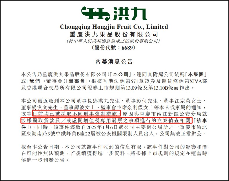 4月16日消息,今日,重慶洪九果品股份有限公司(以下簡稱“洪九果品,06689.HK)發(fā)布公告,公司董事長鄧洪九,董事彭何、江宗英、楊俊文、譚波及監(jiān)事會主席余利霞女士等,目前均已被采取不同刑事強制措施。 原因與重慶市兩江新區(qū)公安分局就涉嫌騙取貸款及╱或虛開增值稅專用發(fā)票的事項進行的立案偵查相關(guān)。 公告稱,自2025年1月6日起公司主要辦公場所之一重慶市渝北區(qū)東湖南路3號中鐵峰匯B座22層被公安機關(guān)限制人員出入,公司無法正常辦公。公司就該事件收到的信息有限,該事件對公司的影響和潛在可能性無法預(yù)測。 洪九果品曾是中國最大的榴蓮分銷商,被稱為“中國水果第一股”,于2022年9月5日在港交所上市,上市首日,洪九果品以每股40港元的價格平開,盤中漲幅一度高達3%,最高市值190億港元。 2023年9月11日到13日,洪九果品控股股東鄧洪九、江宗英夫婦持有的部分H股股份發(fā)生權(quán)益變動。鄧洪九、江宗英持股均從27.1%降至26.12%。這意味著,短短幾天時間,鄧洪九、江宗英持股下降了1.98個百分點。鄧洪九、江宗英累計套現(xiàn)約1億元。 洪九果品自2024年3月20日起停牌,至今已超過一年。截至今日,其股價為1.74元,市值為28億港元。 據(jù)紅星資本局報道,停牌的原因是公司未刊發(fā)2023年全年業(yè)績報告及2024年中期業(yè)績報告。此外,天眼查APP顯示,洪九果品目前共有80條開庭公告和17條法院公告,公司董事江宗英已被限制高消費。 |