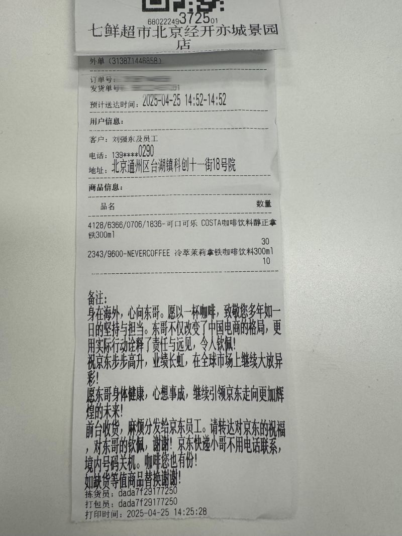 4月25日,北京市經(jīng)開區(qū)京東七鮮亦城景園店后臺接到了一份特殊的訂單,一位遠在海外的匿名用戶下單了85瓶咖啡,向京東集團創(chuàng)始人劉強東及京東員工致敬,并附上情真意切的祝福。 在訂單備注中,該用戶高度贊揚劉強東以責任與遠見引領中國電商發(fā)展的格局,“愿以一杯咖啡,致敬您多年如一日的堅持與擔當”,并祝福京東“步步高升,業(yè)績長虹,在全球市場大放異彩”。此外,用戶特別叮囑配送小哥不用聯(lián)系其本人,并暖心表示:“咖啡您也有份!”并在留言末尾貼心地允許缺貨時替換等值商品。 接到訂單后,京東七鮮團隊迅速響應,確?Х仍诘谝粫r間送達。目前,滿載愛心的85瓶咖啡已全部送到京東外賣騎士、快遞小哥、客服人員及京東七鮮超市揀貨員等一線員工手中,讓這份跨國關懷化作實實在在的溫暖。 與此同時,這份來自異國他鄉(xiāng)的問候迅速在京東內(nèi)部引發(fā)熱議,員工們親切地稱這位匿名用戶為“愛心咖啡俠”,京東官方回應,向這位“愛心咖啡俠”用戶表達謝意,為其準備了終身京東PLUS會員權益,希望愛心一直被傳遞下去。 從海外用戶的85瓶愛心咖啡,到京東回贈的終身PLUS會員權益,這場溫暖的雙向奔赴,恰是京東企業(yè)價值觀的生動注腳。相信這份跨越山海的溫暖,將化作更多人前行的力量,愿每一份善意都能被真誠以待。 |