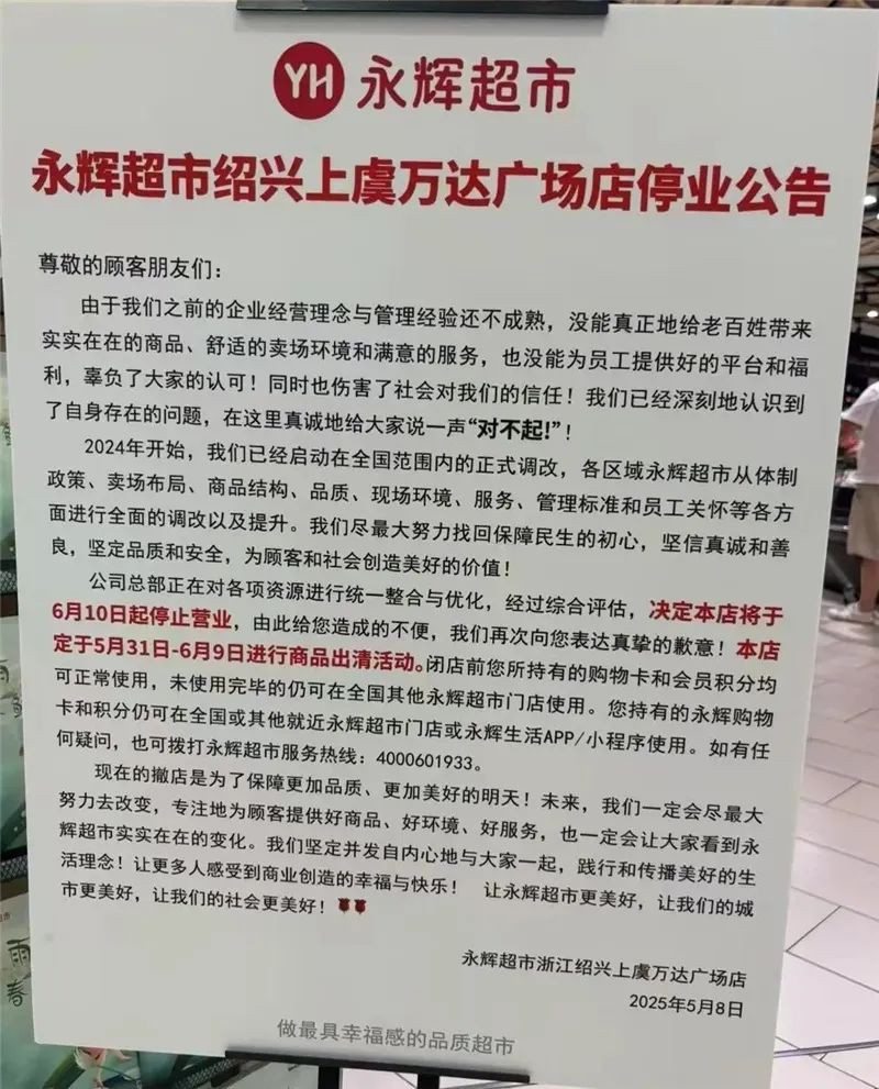 據(jù)越牛新聞報道,紹興上虞萬達廣場的永輝超市即將停業(yè),超市入口處已展示停業(yè)公告。 公告內(nèi)容指出,永輝超市紹興上虞萬達廣場店將從6月10日開始暫停營業(yè),期間5月31日至6月9日將進行商品清倉銷售。官方客服回應記者稱,“這是上虞地區(qū)唯一一家永輝超市,如有顧客持有預付卡或會員卡,請盡快使用余額。剩余未消費的部分,顧客亦可在其他永輝超市門店繼續(xù)消費。 目前,在紹興尚未傳出停業(yè)消息的永輝超市包括解放南路店、笛揚路店、嵊州市和悅廣場店以及嵊州新城吾悅廣場店。持有充值卡的市民可以選擇前往最近的永輝超市進行消費。(越牛新聞) |