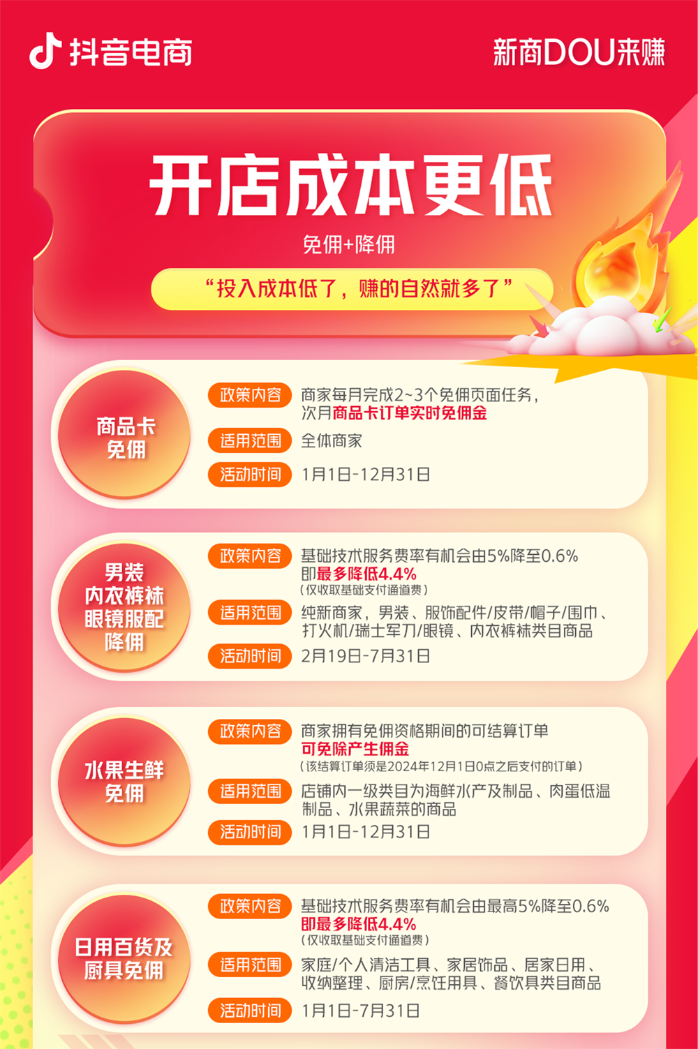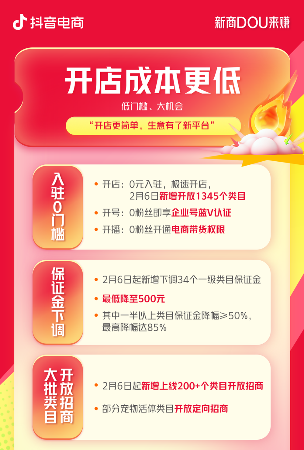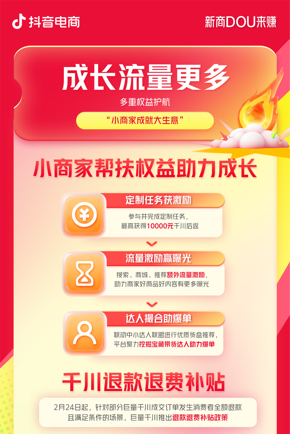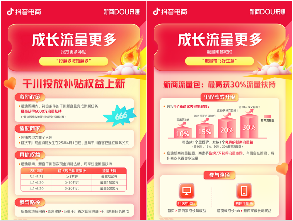 開店成本更低、經(jīng)營指導更強、成長流量更多、運營效率更高!抖音電商【新商DOU來賺】新商政策再次迎來新升級,幫助新商家實現(xiàn)無憂入駐上新即爆,特別是全新上線的千川投放補貼權(quán)益、高效運營工具與專業(yè)培訓指導,讓廣大新商投放效率更高,運營更加得心應手,閱讀下文一起了解最新的政策升級細則。 01 入駐無憂:開店成本更低 低成本開啟新店鋪!抖音電商2月6日新增下調(diào)34個一級類目保證金,最低降至500元,最高降幅85%。同時段新增上線200多個類目開放招商,并對部分活體類目開放定向招商,讓更多商家開啟抖音電商成長之路。 還有持續(xù)進行的商品卡免傭、水果生鮮免傭、日用百貨及廚具免傭、男裝/內(nèi)衣褲襪/眼鏡服配降傭等免傭降傭政策,幫助商家輕裝上陣經(jīng)營好生意。 02 陪伴成長:經(jīng)營指導更強 對于商家們的“開店第一步”,【新商DOU來賺】為新商們提供了翔實、清晰的成長指引。抖音電商全面升級對應政策,針對新商家設立【新商家成長與權(quán)益】專區(qū),通過推廣金流量激勵、千川優(yōu)惠券、專屬新商體驗分、首單獎勵、任務成長路徑等措施,幫助新入駐商家與未開單老商家發(fā)好品,出首單,快速啟動店鋪經(jīng)營。還有幫助商家的鋪貨工具,為有貨源和無貨源的商家提供一站式服務。 03 經(jīng)營提速:成長流量更多 更多流量成就更多銷量,為了讓新商家在開店前期就能收獲更多流量從而先人一步,【新商DOU來賺】推出“小商家?guī)头鰴?quán)益”助力成長,參與并完成定制任務最高獲得10,000元千川后返,還有流量激勵、達人撮合等優(yōu)質(zhì)扶持,助力商家的商品獲得更多曝光,實現(xiàn)生意增長。2月24日上線的千川退款退費補貼政策,進一步幫助新商家減少因退款而產(chǎn)生的經(jīng)營損失,保障長期且穩(wěn)定的生意發(fā)展。 同時,為了激勵新商家們的運營熱情,進行高性價比的流量投放,【新商DOU來賺】全新上線了千川投放補貼權(quán)益,活動周期內(nèi)完成任務,最高獲得6000元流量扶持。還有能讓新商階梯式成長的新商流量包,商家可以通過完成4個關鍵里程碑任務,獲得流量獎勵,最高可獲30%流量扶持。 04 后臺增效:運營效率更高 【新商DOU來賺】還為商家們提供了能夠快速提效的官方運營工具。官方經(jīng)營診斷工具和官方智能客服機器人免費提供商家使用,能夠幫助新商診斷經(jīng)營數(shù)據(jù)、自動回復客戶咨詢。同時還有經(jīng)營必備工具免費使用和7天素材優(yōu)化工具包。有了“好工具”,運營也能再升一級。除了專業(yè)的運營工具之外,政策提供的一對一的運營方法指導和免費的培訓課程,能讓新商們不管是學習新知識還是有疑問,都能得到順暢解答。部分商家還能享受專屬社群服務,實時獲取一手資訊。 抖音搜索抖音小店,開通入駐更便捷,政策新升級,新商DOU來賺,加入正當時! |