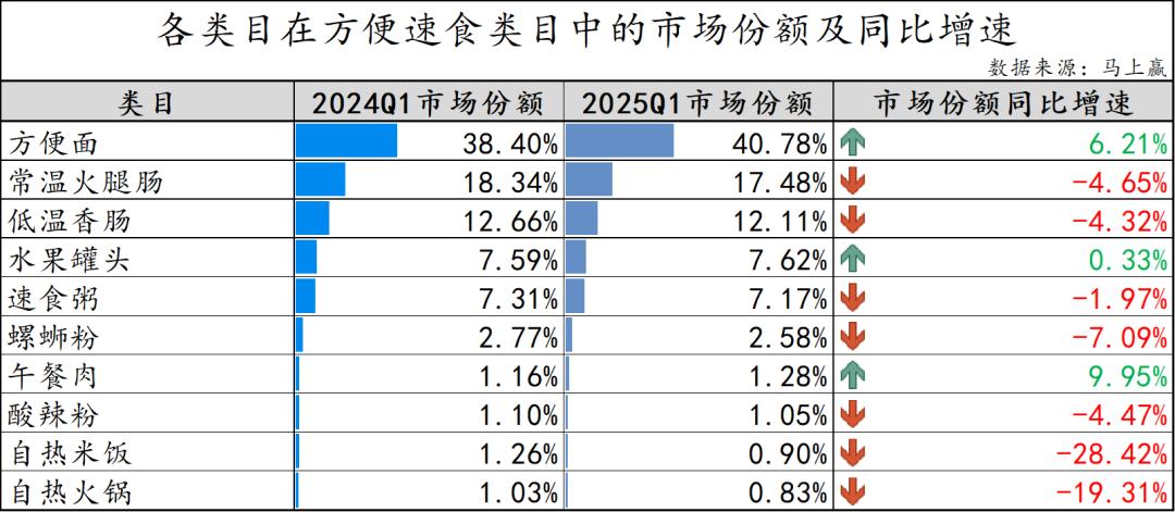 根據(jù)馬上贏情報(bào)站對(duì)2025年第一季度的方便速食市場(chǎng)的回顧,本季度的方便速食市場(chǎng)中,方便面依然穩(wěn)居第一,市場(chǎng)份額超過40%,遙遙領(lǐng)先于常溫火腿腸和低溫香腸,兩者份額均在20%以下。速食粥、水果罐頭等類目市場(chǎng)份額在5%左右。 從市場(chǎng)份額增速的角度看,方便面條和午餐肉增速亮眼,方便面、水果罐頭等規(guī)模較大的類目維持正增長(zhǎng)態(tài)勢(shì)。相對(duì)而言,自熱火鍋、自熱米飯等類目同比下滑明顯;低溫香腸、常溫火腿腸也呈現(xiàn)微跌。(馬上贏情報(bào)站) |