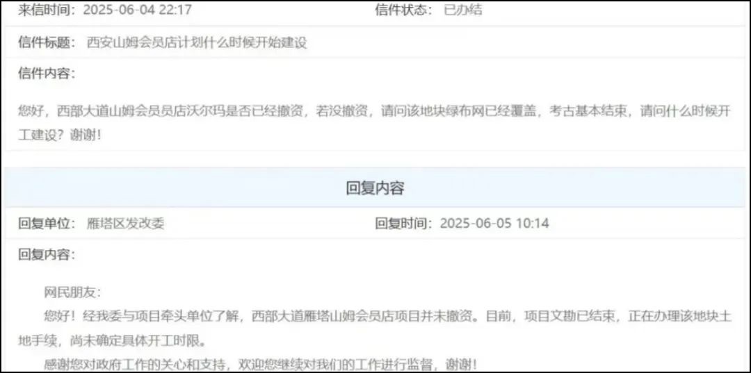 6月5日,雁塔區(qū)發(fā)改委就網(wǎng)友咨詢“山姆西安雁塔店計(jì)劃什么時(shí)候開(kāi)始建設(shè)?”回復(fù)稱:經(jīng)我委與項(xiàng)目牽頭單位了解,目前,項(xiàng)目文勘已結(jié)束,正在辦理該地塊土地手續(xù),尚未確定具體開(kāi)工時(shí)限。 |