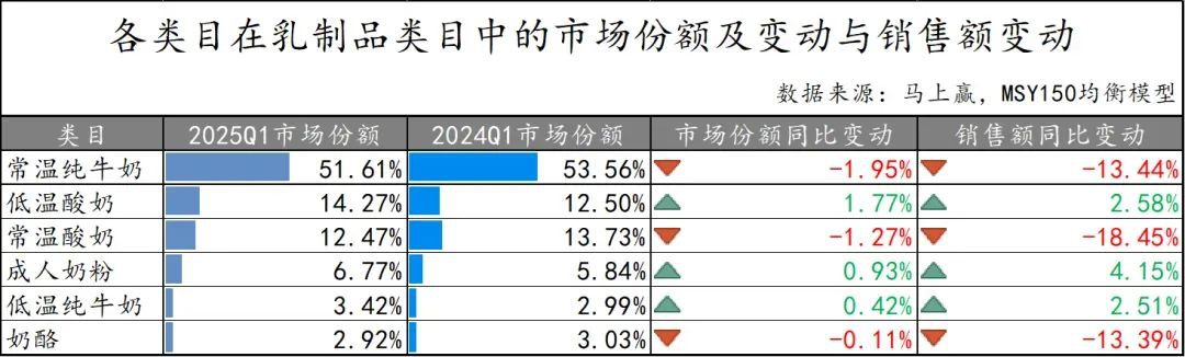 日前,據(jù)馬上贏報(bào)告,基于市場(chǎng)份額和銷售額的同比變動(dòng)分析,2025年第一季度常溫純牛奶、常溫酸奶和奶酪三大類目表現(xiàn)較為嚴(yán)峻,面臨市場(chǎng)份額與銷售額的雙重萎縮。上述三個(gè)類目的市場(chǎng)份額均呈現(xiàn)同比下跌,同時(shí)銷售額也均呈現(xiàn)>13%的下滑態(tài)勢(shì)。相比之下,低溫品類表現(xiàn)相對(duì)穩(wěn)健,低溫酸奶和低溫純牛奶不僅市場(chǎng)份額同比提升,銷售額也保持正向增長(zhǎng)。此外,結(jié)合老齡化的人口大趨勢(shì),成人奶粉類目也表現(xiàn)較好,市場(chǎng)份額和銷售額同比均有所增長(zhǎng)。(馬上贏情報(bào)站) |