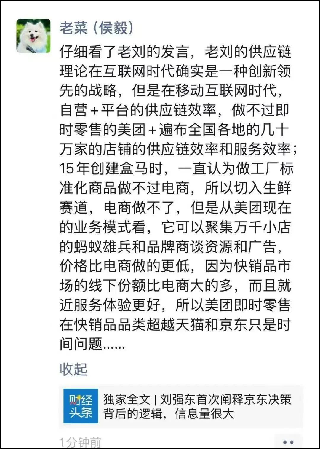 侯毅在朋友圈轉(zhuǎn)發(fā)關于劉強東近日小范圍分享會內(nèi)容,并表示:老劉的供應鏈理論在互聯(lián)網(wǎng)時代確實是一種創(chuàng)新領先的戰(zhàn)略,但是在移動互聯(lián)網(wǎng)時代自營+平臺的供應鏈效率,做不過即時零售的美團+遍布全國各地的幾十萬家的店鋪的供應鏈效率和服務效率。 侯毅還表示,15年創(chuàng)建盒馬時,一直認為做工廠標準化商品做不過電商,所以切入生鮮賽道,電商做不了,但是從美團現(xiàn)在的業(yè)務模式看,它可以聚集萬千小店的螞蟻雄兵和品牌商談資源和廣告,價格比電商做的更低,因為快銷品市場的線下份額比電商大的多,而且就近服務體驗更好,所以美團即時零售在快銷品品類超越天貓和京東只是時間問題。(新浪科技) |