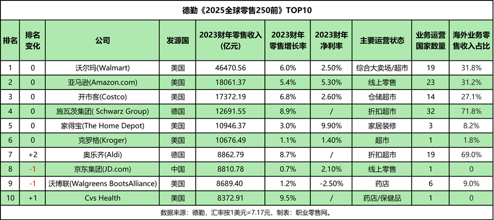 日前,德勤發(fā)布《2025 全球零售力量》研究報告,以2023年7月-2024年6月財年數(shù)據(jù)為基礎(chǔ),全面剖析了全球零售業(yè)在“復(fù)蘇與壓力交織”下的最新態(tài)勢。 報告顯示,全球零售業(yè)正經(jīng)歷深刻結(jié)構(gòu)性調(diào)整,呈現(xiàn)“總量擴張、結(jié)構(gòu)分化”的顯著特征。 從整體規(guī)?矗2023財年全球250強零售企業(yè)總收入達6.03萬億美元(約合人民幣43.4萬億元),同比增長 3.6%;凈利潤率 3.7%,平均銷售額241億美元(約合人民幣1728億元),整體復(fù)合增長率3.7%。行業(yè)集中度持續(xù)攀升,前十強企業(yè)貢獻了34.9%的收入份額,而不同業(yè)態(tài)、區(qū)域間的增長差異進一步擴大。 細分領(lǐng)域中,多元化產(chǎn)品(+8.3%)與服裝配飾(+7.9%)成為增長最快的品類;18家新晉企業(yè)首次躋身250強,美英企業(yè)占近半數(shù),貢獻新入榜企業(yè)41%的收入,其中7家為超市零售商,印證生活必需品消費的強勢復(fù)蘇——94%的新晉企業(yè)實現(xiàn)收入正增長,61%增速達兩位數(shù)。 消費市場“性價比”導(dǎo)向推動折扣業(yè)態(tài)發(fā)展,4家折扣零售商新晉上榜,且增長最快的20家企業(yè)中,快速消費品企業(yè)占半數(shù)席位。區(qū)域?qū)用,歐洲和亞太地區(qū)雖保持領(lǐng)先,但在“增長最快20強”中的占比從去年的58%降至31.6%,新興市場活力漸顯。 此外,希音(Shein)以2018-2023財年88.2%的年均復(fù)合增長率位居全球增長榜首,2023財年仍保持17%增速;阿里巴巴以35%的年均增長率排名第六,主要得益于電子產(chǎn)品與家電品類的強勁表現(xiàn),共同展現(xiàn)了全球零售市場的多元活力。 01 全球前十強 中國僅京東入選 沃爾瑪、亞馬遜、開市客(Costco)連續(xù)三年穩(wěn)居前三,德國施瓦茨集團(Lidl母公司)位列第四,家得寶、克羅格、奧樂齊(上升2位)分列五至七位,京東、沃博聯(lián)均下降1位,分別排名第八、第九位,CVS上升1位至第十位。 從國家來看,美國獨占7席,德國2席,中國僅京東1家入選。目前,前十強外資企業(yè)中,僅有沃爾瑪、開市客、奧樂齊3家在中國大陸開展實體業(yè)務(wù)。 從業(yè)態(tài)構(gòu)成來看,5家屬于超市業(yè)態(tài)(其中Lidl母公司和奧樂齊為折扣超市),線上零售和藥妝業(yè)態(tài)各2家,家居裝修業(yè)態(tài)1家。 02 中國14家企業(yè)上榜 永輝超市、華潤萬家、物美均上榜 中國(含港澳臺地區(qū))共有14家企業(yè)入圍全球250強,合計創(chuàng)造2964.4億美元(約合人民幣2.13萬億元)零售收入,占全球250強總收入的4.92%,整體呈現(xiàn)“內(nèi)需驅(qū)動”特征——海外業(yè)務(wù)占比僅18.1%。 14 家企業(yè)包括:京東集團、希音、阿里巴巴、屈臣氏集團、唯品會、周大福、永輝超市、統(tǒng)一商超、牛奶國際、老鳳祥、蘇寧易購、物美科技、華潤萬家、全聯(lián)實業(yè)。 部分企業(yè)排名出現(xiàn)下滑:阿里巴巴下降22位至第49名,永輝超市下降19位至第120名,蘇寧易購下降25位至第148名,華潤萬家下降17位至第166名。 03 未來零售的四大核心趨勢 德勤在《2025 全球零售力量報告》中指出,未來零售業(yè)將聚焦四大核心趨勢:運營效率升級(通過精益化管理優(yōu)化成本結(jié)構(gòu))、技術(shù)深度融合(AI 等前沿技術(shù)加速商業(yè)場景落地)、可持續(xù)發(fā)展深化(ESG 戰(zhàn)略持續(xù)影響行業(yè)決策)、收入多元化探索(企業(yè)積極開拓新興增長賽道)。這四大趨勢將共同塑造零售業(yè)的新生態(tài)。 趨勢一:戰(zhàn)略級運營效率提升 全球零售業(yè)正面臨增長放緩的挑戰(zhàn)。受消費者需求疲軟影響,行業(yè)增速顯著下滑,預(yù)計未來五年全球經(jīng)濟增速將維持在3.1%左右。在此背景下,提升運營效率已成為零售企業(yè)的核心戰(zhàn)略,而庫存管理則是重中之重。 隨著消費渠道日趨多元(線上平臺、社交電商等快速崛起),全渠道庫存管理的復(fù)雜度大幅提升。它不僅需要實現(xiàn)供應(yīng)鏈的統(tǒng)一協(xié)調(diào),更要通過數(shù)據(jù)打通提升銷售可視性 —— 例如,讓消費者在任何渠道都能實時查詢庫存、享受 “線上下單、門店自提” 等無縫體驗。領(lǐng)先企業(yè)已通過數(shù)字化工具實現(xiàn)庫存動態(tài)調(diào)配,既能減少滯銷品積壓,又能避免熱銷品缺貨,在降本的同時最大化客戶滿意度。 趨勢二:AI驅(qū)動的技術(shù)全場景滲透 人工智能正從“輔助工具”升級為零售行業(yè)的“核心生產(chǎn)力”,深度重塑全鏈路運營。 在線上端,AI技術(shù)已全面滲透至精準(zhǔn)運營環(huán)節(jié):智能搜索系統(tǒng)通過分析用戶行為預(yù)測偏好,不僅能推送匹配商品,更能通過“場景化推薦”(如“露營裝備組合”“節(jié)日禮盒搭配”)激發(fā)潛在需求;自動生成的營銷文案和商品描述,結(jié)合語義分析優(yōu)化關(guān)鍵詞,可將搜索轉(zhuǎn)化率提升 20% 以上。 在線下端,數(shù)字技術(shù)正重構(gòu)門店體驗:數(shù)碼標(biāo)牌實時更新促銷信息,智能購物車通過RFID技術(shù)自動結(jié)算,電子貨架標(biāo)簽實現(xiàn)價格一鍵同步,VR/AR 試穿試戴則打破傳統(tǒng)購物的空間限制。技術(shù)的融合讓“線上線下無差別體驗”成為現(xiàn)實,推動零售從“賣商品”向“賣服務(wù)”轉(zhuǎn)型。 趨勢三:循環(huán)經(jīng)濟加速落地,可持續(xù)成核心競爭力 
