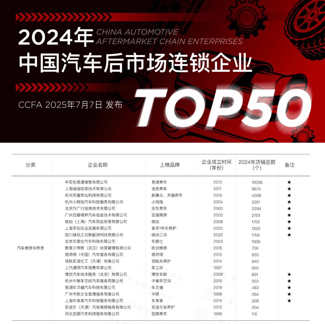 7月7日,中國連鎖經(jīng)營協(xié)會(CCFA)發(fā)布 2024 年中國汽車后市場連鎖企業(yè)Top50榜單。數(shù)據(jù)顯示,上榜企業(yè)門店總數(shù)達(dá)24.04萬個(gè),其中含新增新能源充電服務(wù)類門店14.96萬個(gè);與 2023 年同期(統(tǒng)計(jì)口徑包含汽車維修保養(yǎng)、洗車美容裝具及供應(yīng)鏈類企業(yè))相比,門店總數(shù)同比增長約7.08%。 從規(guī)模看Top50企業(yè)中擁有1000個(gè)以上連鎖門店的達(dá)31家。從成立時(shí)間分布來看,20年以上的有14家,11-20年(含)的有10家,5-10年(含)的有25家,5年以下的僅1家,顯示行業(yè)以成熟企業(yè)為主體,同時(shí)不乏成長中的新銳力量。 |