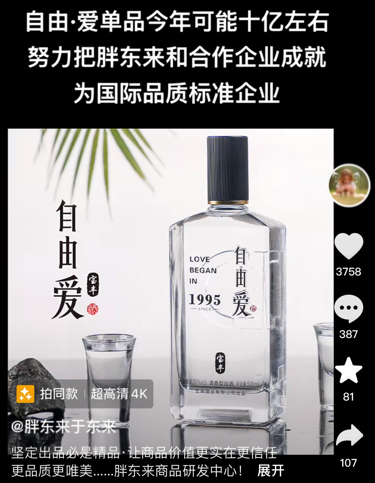 近日,胖東來創(chuàng)始人于東來在社交平臺中透露,“自由愛單品今年(營收)可能十億左右,努力把胖東來和合作企業(yè)成就為國際品質(zhì)標(biāo)準(zhǔn)企業(yè)!2022年底,胖東來與寶豐酒廠聯(lián)合推出了“寶豐·自由愛”,該產(chǎn)品市場表現(xiàn)亮眼。 不久前,于東來還發(fā)布了“酒鬼·自由愛”的包裝圖片。據(jù)了解,這款產(chǎn)品為胖東來和酒鬼酒聯(lián)合打造的馥郁香型白酒,酒精度是52度,容量為550ml,價(jià)格尚未公布。 此外,于東來還指出,胖東來啤酒規(guī)?刂圃10億左右,要做世界高品質(zhì)的中小規(guī)模品牌。 |