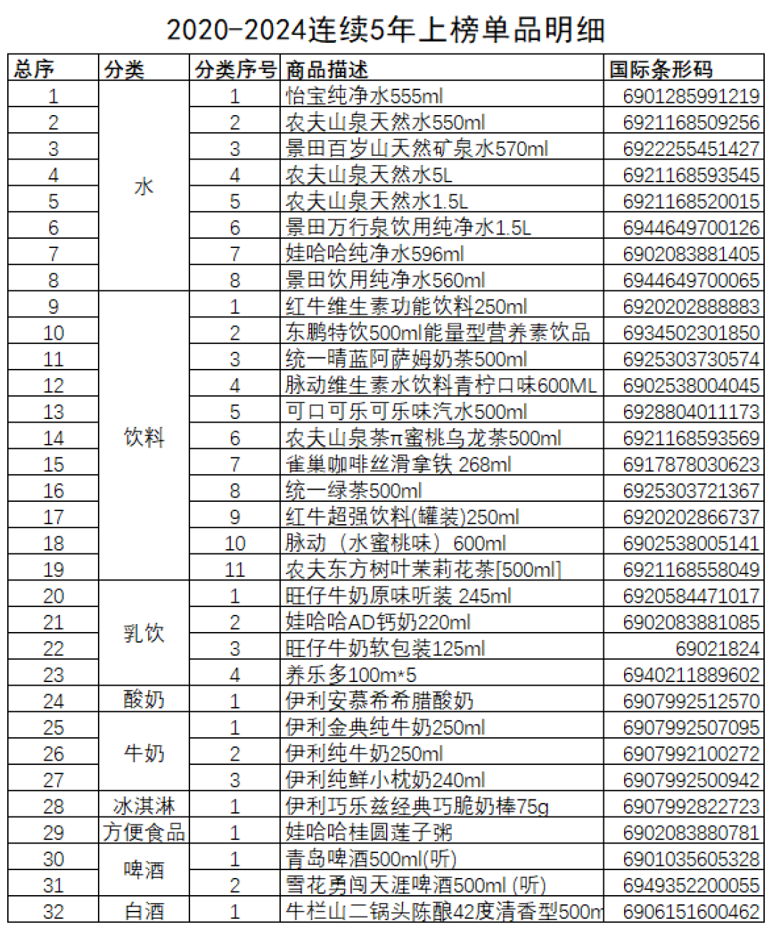 7月1日17日,中國連鎖經(jīng)營協(xié)會(huì)發(fā)布中國便利店五年暢銷商品名單。 從五年銷售統(tǒng)計(jì)名單看,水、牛奶單品數(shù)保持穩(wěn)定,飲料、白酒和啤酒品項(xiàng)數(shù)比前兩年增多,酸奶、乳飲料、冰淇淋、方便速食、休閑食品比前兩年品項(xiàng)數(shù)下降。 基于連續(xù)5年發(fā)布的銷售統(tǒng)計(jì),共有32個(gè)單品持續(xù)出現(xiàn)在名單中。水有8個(gè)單品,飲料有11個(gè)單品,乳飲料有4個(gè),牛奶有3個(gè),啤酒有2個(gè),酸奶、冰激凌、方便食品和白酒各有1個(gè)單品。 縱觀5年各品類表現(xiàn),可以看出:暢銷商品更加集中于某些品牌;暢銷商品的汰換率漸漸趨緩。 |