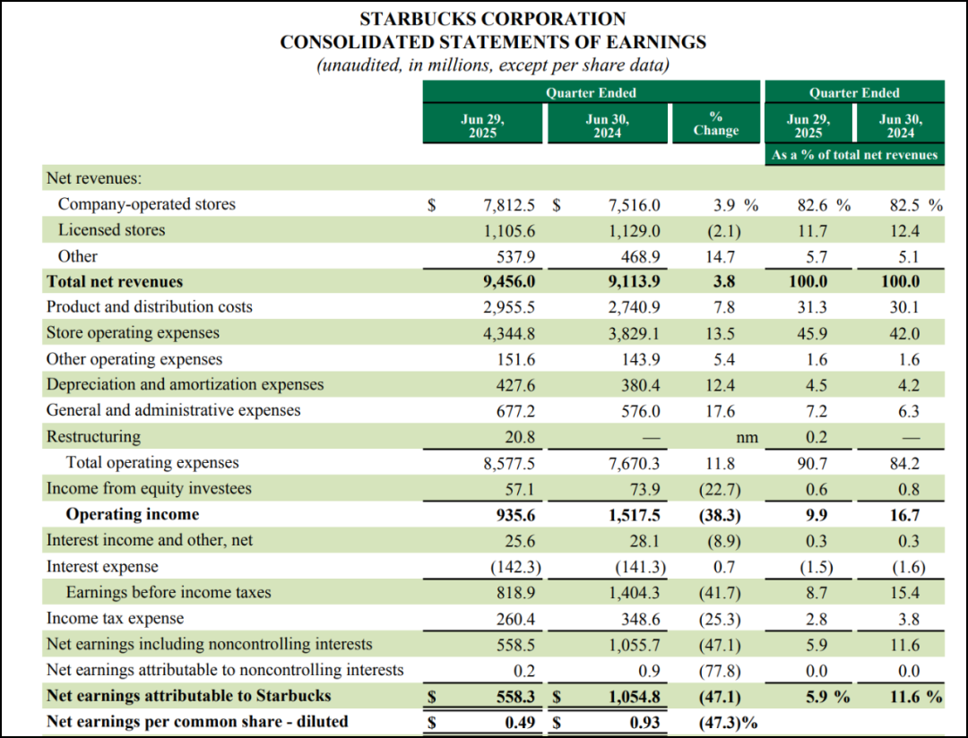 7月30日,星巴克公布2025年第三季度財報。整體來看,整體呈現(xiàn)喜憂交織的態(tài)勢,而中國市場表現(xiàn)尤為亮眼。同時,公司首席執(zhí)行官Brian Niccol(倪睿安)確認,已有超20家意向合作方對中國業(yè)務(wù)展現(xiàn)出濃厚興趣。 財報數(shù)據(jù)顯示,星巴克第三財季凈營收達95億美元,同比增長約4%;歸屬于公司的凈利潤為5.583億美元,但整體同店銷售下降2%。分區(qū)域看,北美市場凈營收69.27億美元,同比增長2%;國際市場凈營收20.11億美元,同比增長9%。 中國市場的表現(xiàn)頗為突出。第三季度營收7.9億美元,較去年同期的7.3億美元增長8%;同店銷售額同比增長2%。值得關(guān)注的是,其經(jīng)營利潤率環(huán)比持續(xù)提升,維持在兩位數(shù)的健康水平,這意味著在交易量增長的驅(qū)動下,不僅部分抵消了客單價下降的影響,還保持了良好的盈利狀態(tài)。 門店擴張方面,第三季度星巴克全球凈新增308家門店,期末全球門店總數(shù)達41097家,其中53%為公司直營店占比。截至該財季末,中國市場門店數(shù)達7828家,較去年同期凈增522家,增幅7%,環(huán)比上一季度凈增70家,本季度內(nèi)還新進入17個縣級市場。 對于星巴克中國區(qū)將出售部分股權(quán)的市場傳聞,Brian Niccol透露,公司正積極尋找與自身愿景、價值觀一致,且能助力本地高效運營的戰(zhàn)略合作伙伴。目前已有超20家意向方表達濃厚興趣,星巴克正在對各類合作方案進行評估。他強調(diào),公司對中國市場的承諾始終不變,且希望在合作中保留相當(dāng)比例的股權(quán)。 在他看來,眾多意向方主動尋求合作的態(tài)度,恰好印證了星巴克在華擁有優(yōu)秀團隊、強大品牌影響力,以及在中國市場的長期發(fā)展?jié)摿。他同時明確,星巴克只會推進真正符合自身利益的交易。 對于合作方的選擇標(biāo)準(zhǔn),Brian Niccol 補充了兩個核心條件:一是必須與星巴克擁有共同的使命和價值觀,“在這一根本點上必須保持一致”;二是能成為助力品牌在本地市場實現(xiàn)更高效運營的絕佳伙伴。 |