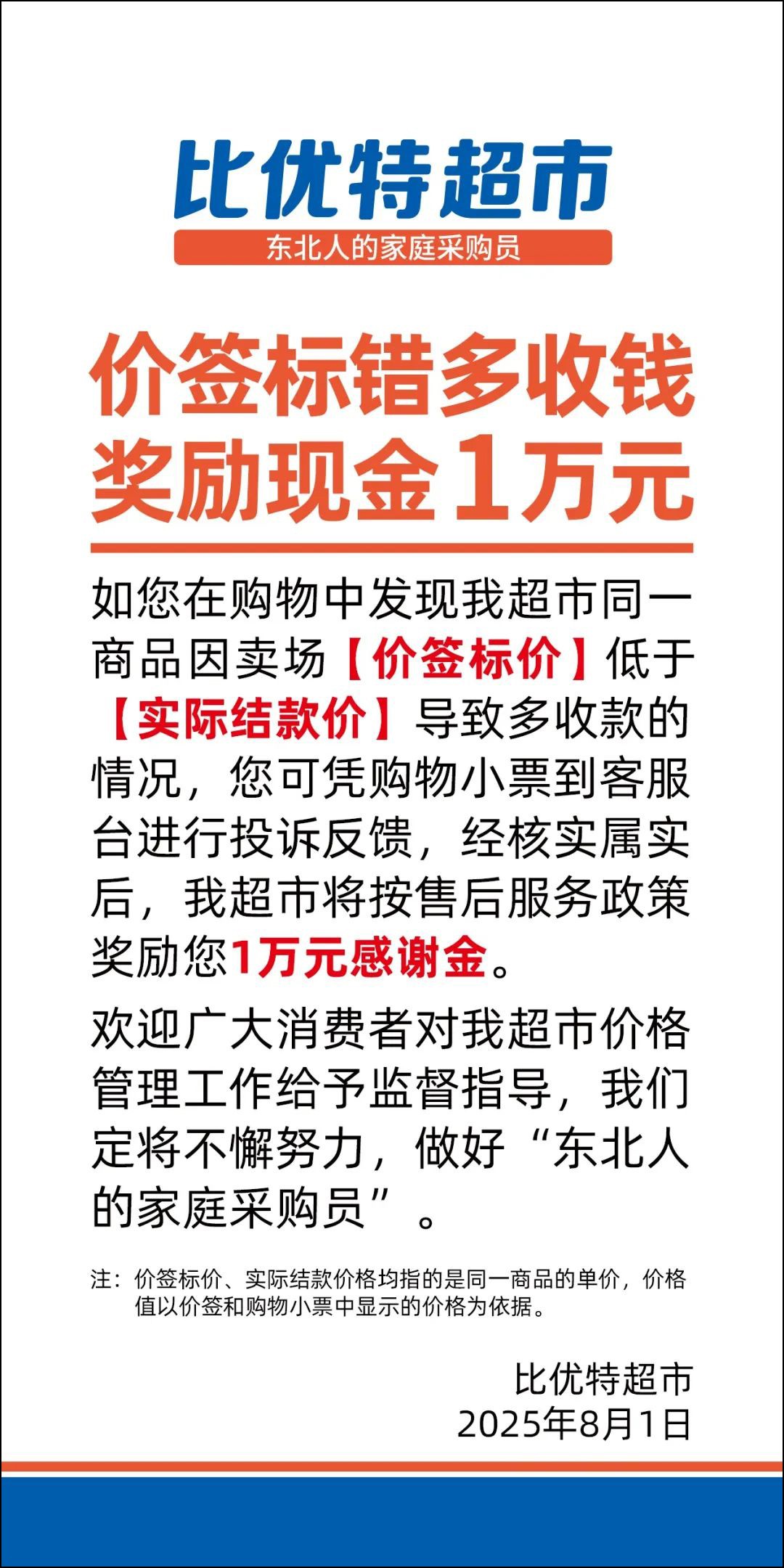 近日,比優(yōu)特超市正式推出一項(xiàng)重磅售后承諾:“價(jià)簽標(biāo)錯(cuò),萬元獎(jiǎng)勵(lì)”! 據(jù)《話沈陽》報(bào)道,該政策的推出源于此前一起消費(fèi)糾紛:一位消費(fèi)者在哈爾濱比優(yōu)特超市購買櫻桃時(shí),遇到實(shí)際收費(fèi)高于標(biāo)價(jià)的情況。經(jīng)消費(fèi)者向媒體反映后,超市已向其賠償500元。 以此為鑒,比優(yōu)特超市鄭重承諾:自8月1日起,若消費(fèi)者在門店購物時(shí)發(fā)現(xiàn)價(jià)簽標(biāo)錯(cuò)并被多收費(fèi)用,經(jīng)核實(shí)后將獲得 1 萬元現(xiàn)金獎(jiǎng)勵(lì)。 有網(wǎng)友通俗解釋這一政策:“比如商品價(jià)簽標(biāo)1塊,實(shí)際收了2塊,只要消費(fèi)者發(fā)現(xiàn)并核實(shí),就能獲得1萬元獎(jiǎng)勵(lì)! 對(duì)于這樣的政策,你怎么看? |