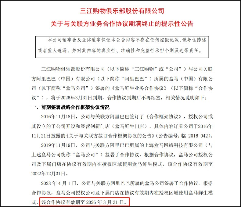 8月5日,三江購物公告,其與阿里巴巴集團(tuán)所屬的盒馬(中國)有限公司簽署的《盒馬鮮生業(yè)務(wù)合作協(xié)議》將于2026年3月31日到期,到期后不再續(xù)簽。此次協(xié)議終止直接影響全資子公司浙江浙海華地網(wǎng)絡(luò)科技有限公司。 該子公司財(cái)務(wù)數(shù)據(jù)顯示持續(xù)增長:2022年?duì)I收4.29億元,凈利潤720.13萬元;2023年?duì)I收4.47億元,凈利潤1126.4萬元;2024年?duì)I收5.5億元,凈利潤1833.26萬元;2025年一季度營收1.6億元,凈利潤826.07萬元。三江購物表示,將盡快商議協(xié)議終止的相關(guān)過渡及交接事宜。 |