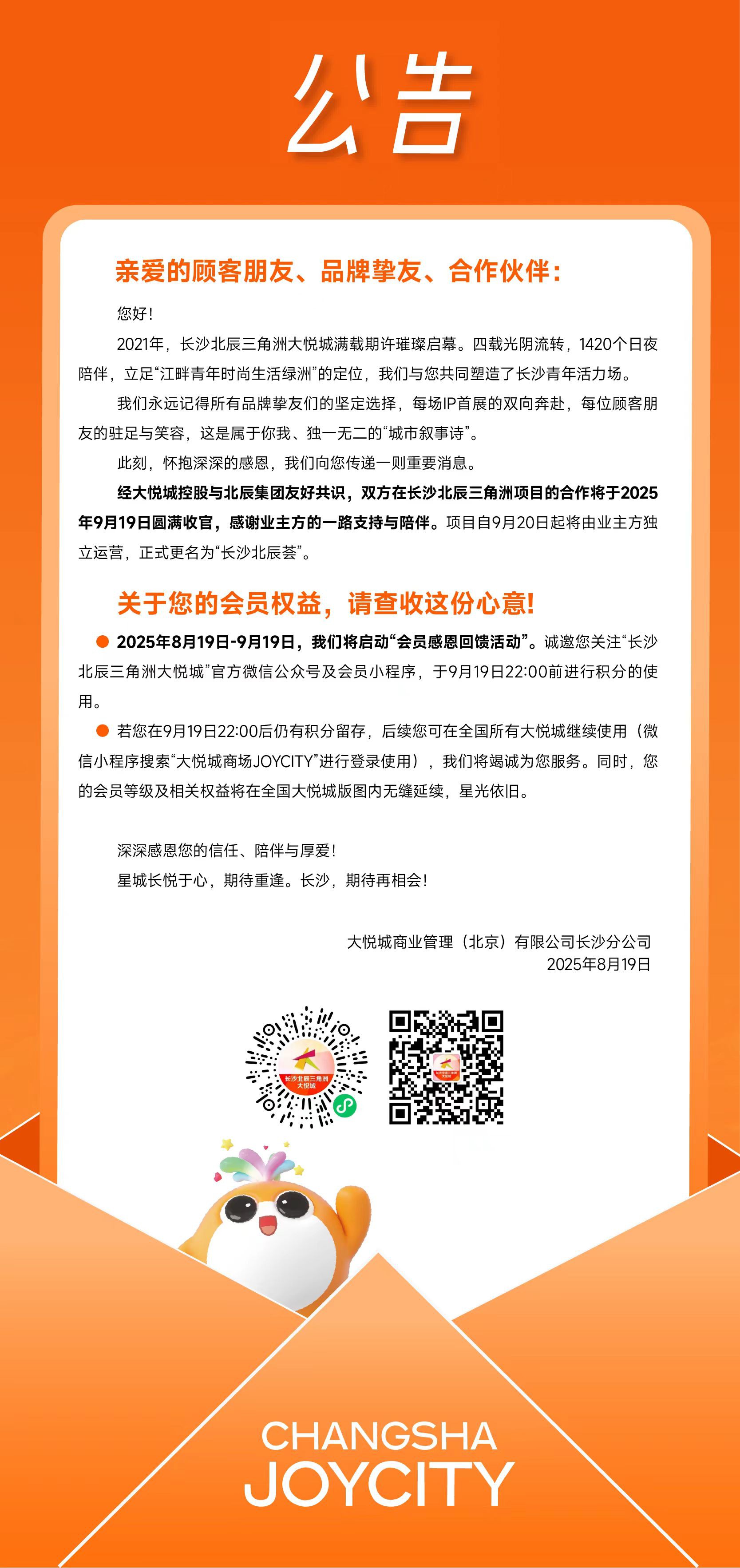 8月19日,大悅城長(zhǎng)沙分公司發(fā)布公告稱,經(jīng)大悅城控股與北辰集團(tuán)友好協(xié)商,雙方在長(zhǎng)沙北辰三角洲項(xiàng)目的合作將于 2025年9月19日?qǐng)A滿收官,感謝業(yè)主方的一路支持與陪伴。自9月20日起,該項(xiàng)目將由業(yè)主方獨(dú)立運(yùn)營(yíng),并正式更名為“長(zhǎng)沙北辰薈”。 關(guān)于會(huì)員權(quán)益,9月19日22:00前,會(huì)員仍可正常在公眾號(hào)及小程序使用相關(guān)權(quán)益;若權(quán)益中仍有金額留存,全國(guó)所有大悅城門(mén)店將支持繼續(xù)使用。 資料顯示,長(zhǎng)沙北辰三角洲大悅城于2021年9月30日開(kāi)業(yè),至今僅運(yùn)營(yíng)4年便迎來(lái)合作收官,不禁令人唏噓。 |