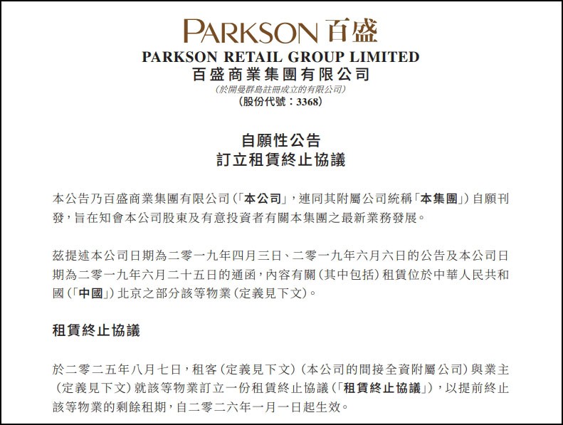 近日,百盛商業(yè)集團(tuán)一則自愿性公告,讓其與中工美多年的合作正式走向終結(jié)。根據(jù)協(xié)議,百盛集團(tuán)的間接全資附屬公司百盛商業(yè)發(fā)展有限公司將提前終止與中工美的租賃合同,涉及的物業(yè)包括中工美的多個(gè)樓層和區(qū)域,總面積約為1.724萬平方米,該租賃協(xié)議的終止日期定于2026年1月1日。與此同時(shí),百盛商業(yè)需向中工美支付1170.12萬元罰款,并在2025年10月10日前完成支付。若逾期支付,百盛商業(yè)將按未償還總額的0.05%每日支付額外罰金,直至付款為止。這意味著,位于北京復(fù)興門的百盛將于今年底閉店。(北京商報(bào)) |