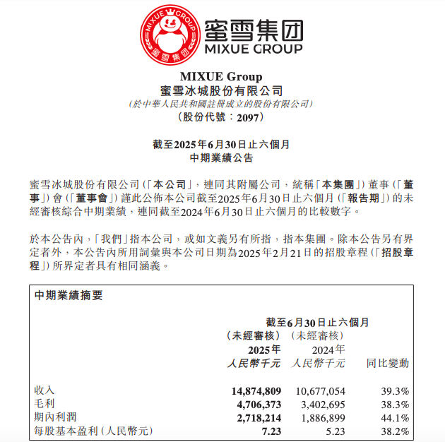 8月27日,蜜雪集團發(fā)布2025年上半年業(yè)績報告,核心財務(wù)指標(biāo)均實現(xiàn)高雙位數(shù)增長。報告顯示,上半年實現(xiàn)收入148.7億元,同比增長39.3%;毛利47.1億元,同比增長38.3%;凈利潤27.2億元,同比增長44.1%。 蜜雪集團在財報中表示,業(yè)績增長主要得益于供應(yīng)鏈能力提升、品牌IP建設(shè)及門店運營的持續(xù)優(yōu)化。 門店規(guī)模方面,截至2025年6月30日,蜜雪集團全球門店數(shù)增至53014家,較去年同期新增9796家門店,門店網(wǎng)絡(luò)覆蓋中國及12個海外國家。內(nèi)地市場方面,蜜雪集團加大對下沉市場的深度覆蓋。截至上半年,蜜雪集團來自三線及以下城市的門店數(shù)達(dá)到27804家,占內(nèi)地門店比例達(dá)到57.6%,較去年同期新增5707家門店。 供應(yīng)鏈方面,目前蜜雪集團的采購網(wǎng)絡(luò)已覆蓋全球六大洲、38個國家。生產(chǎn)端上,蜜雪集團在全國已建立五大生產(chǎn)基地和70余條智能生產(chǎn)線;物流端上,截至上半年,其在中國共設(shè)有29個倉庫(較去年三季度新增2座倉庫),配送網(wǎng)絡(luò)覆蓋中國33個省級行政區(qū)(含香港、澳門)及超300個地級市,同時在4個海外國家建立本地化倉儲體系與配送網(wǎng)絡(luò)。 研發(fā)投入與產(chǎn)品創(chuàng)新方面,蜜雪集團逐步構(gòu)建起完整研發(fā)體系。財報顯示,報告期內(nèi)研發(fā)開支為4100萬元,較去年同期同比增加 1.7%;產(chǎn)品創(chuàng)新上,蜜雪冰城與幸運咖均推出多款新品,其中幸運咖5月推出的 “真果咖” 系列產(chǎn)品,上市后單月銷售額突破1億元。 值得一提的是,今年3月3日,蜜雪冰城股份有限公司(蜜雪集團,股票代碼為2097.HK)于香港聯(lián)交所主板成功掛牌上市,發(fā)行價為202.5港元/股;截至8月27日收盤,公司股價報460.4港元/股,總市值達(dá)1748億港元。 |