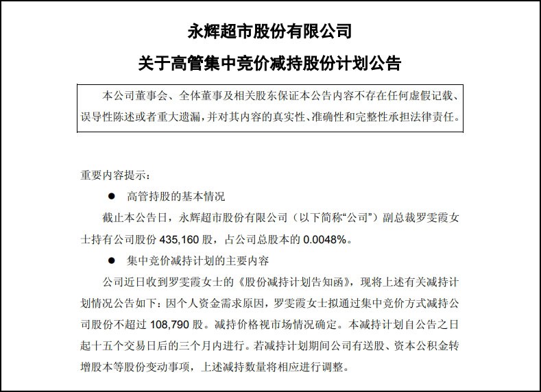 10月15日,永輝超市公告,公司副總裁羅雯霞計(jì)劃通過集中競(jìng)價(jià)方式減持不超過108,790股,占公司總股本的0.0012%。減持原因?yàn)閭(gè)人資金需求,減持計(jì)劃將在公告之日起十五個(gè)交易日后的三個(gè)月內(nèi)進(jìn)行,具體減持時(shí)間、價(jià)格和數(shù)量將視市場(chǎng)情況而定。(南財(cái)快訊) |