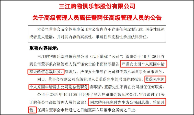 10月29日,三江購物發(fā)布公告,宣布公司高級管理人員的變動情況。 公告顯示,嚴(yán)謹(jǐn)女士因個人原因辭去輪值總裁職務(wù),同時繼續(xù)擔(dān)任公司董事;藍(lán)蔚先生因個人原因辭去副總裁職務(wù),并將不再在公司及其控股子公司任職。 此次變動中,張家付先生被聘任為公司副總裁及輪值總裁,任期至第六屆董事會屆滿之日止。張家付先生具備相應(yīng)任職資格,不存在不適宜擔(dān)任該職務(wù)的情形。 資料顯示,張家付先生,中國國籍,1988年10月18日出生,本科學(xué)歷。曾任三江購物門店店長、區(qū)域總經(jīng)理、農(nóng)產(chǎn)品基地開發(fā)總經(jīng)理,現(xiàn)任三江購物生鮮業(yè)務(wù)總監(jiān)。 同日,三江購物還發(fā)布三季度財(cái)報(bào)。報(bào)告顯示,2025年第三季度營業(yè)收入10億元,同比下降0.81%;歸屬于上市公司股東的凈利潤為2312.08萬元,同比下降46.64%。前三季度營業(yè)收入為29.88億元,同比增長0.59%;歸屬于上市公司股東的凈利潤為1.14億元,同比下降5.42%。 期內(nèi),三江購物新開門店2家,關(guān)閉門店3家。截至期末,三江購物門店總數(shù)為184家,寧波市內(nèi)社區(qū)店數(shù)量為102家(盒馬店7家、鄰里店60家),寧波以外地區(qū)社區(qū)店11家(鄰里店4家)。 |