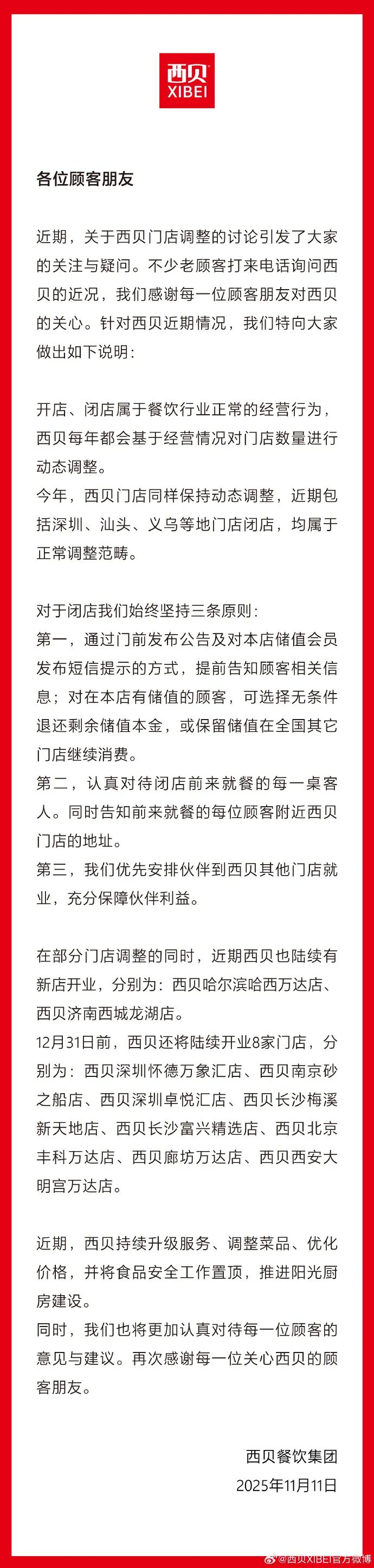 自10月以來,西貝多地已累計閉店近10家。對于全國多地閉店的情況,11月11日,西貝餐飲集團發(fā)布聲明稱,開店、閉店屬于餐飲行業(yè)正常的經(jīng)營行為,西貝每年都會基于經(jīng)營情況對門店數(shù)量進(jìn)行動態(tài)調(diào)整。今年,西貝門店同樣保持動態(tài)調(diào)整,近期包括深圳、汕頭、義烏等地門店閉店,均屬于正常調(diào)整范疇。 |