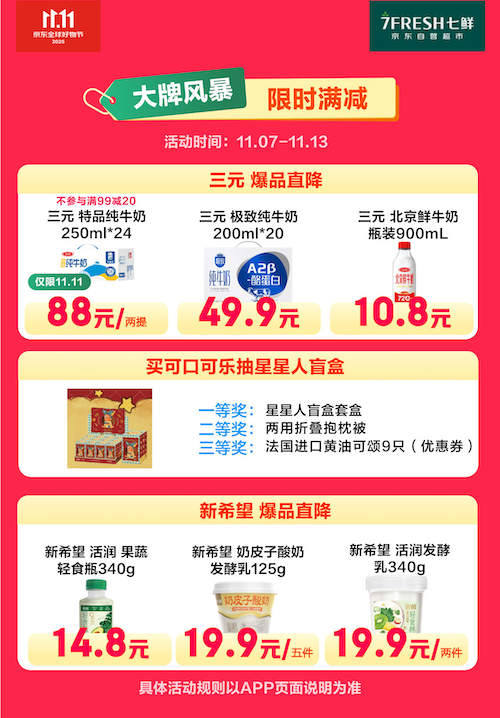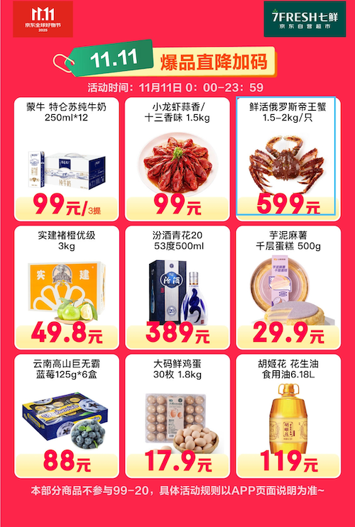 京東七鮮11.11今日啟動(dòng)“終極放價(jià)”,全線商品價(jià)格再度擊穿,全時(shí)間段火力全開!11月11日,消費(fèi)者不僅可享多款人氣爆品直接降價(jià),更有全品類、近萬種商品加入“滿99減20”優(yōu)惠行列。每位用戶可領(lǐng)取三張即時(shí)到賬的優(yōu)惠券,線上線下通用,輕松湊單,立減無套路,實(shí)現(xiàn)“加購即省、暢快囤貨”的購物體驗(yàn)。 多款熱門爆品今日迎來價(jià)格直降:家庭聚餐寵兒鮮活波士頓龍蝦,單只(規(guī)格8兩至1斤)僅需88元,肉質(zhì)緊實(shí)品,蝦肉滿滿,品質(zhì)與性價(jià)比兼具;高端海鮮的代表——鮮活俄羅斯帝王蟹(單只重約3-4斤),更以599元的驚爆價(jià)登場(chǎng),擊穿秋冬高端海鮮市場(chǎng)價(jià),為饕客帶來難得嘗鮮良機(jī)。云南高山巨無霸藍(lán)莓125g*6盒,果徑超22mm,整箱僅需88元。青花20汾酒53度500ml,聚餐與自飲絕佳選擇,價(jià)格同步直降至389元。 從應(yīng)季水果到鮮活水產(chǎn),從品質(zhì)肉禽到日用百貨,即刻下單,即刻鎖定京東七鮮終極放價(jià)福利!打開京東APP自營(yíng)秒送、七鮮APP或微信小程序,疊加最快30分鐘送達(dá)的履約服務(wù),新鮮、美味與實(shí)惠速速帶回家!新用戶專享商品低至0.01元,前4單返券優(yōu)惠最高可減77元。 |