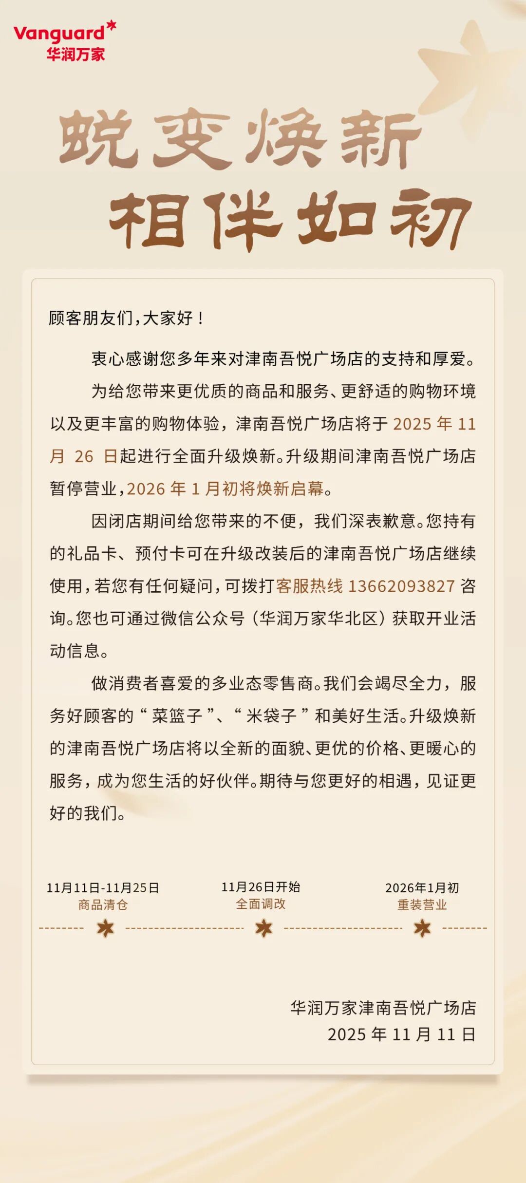 11月26日,華潤(rùn)萬家宣布,天津首家調(diào)改店——津南吾悅廣場(chǎng)店,即日起全面啟動(dòng)升級(jí)煥新。升級(jí)期間,該店暫停營(yíng)業(yè),預(yù)計(jì)將于2026年1月初煥新啟幕。因閉店帶來的不便,我們深表歉意。您持有的禮品卡、預(yù)付卡可在煥新后的津南吾悅廣場(chǎng)店繼續(xù)使用。 |