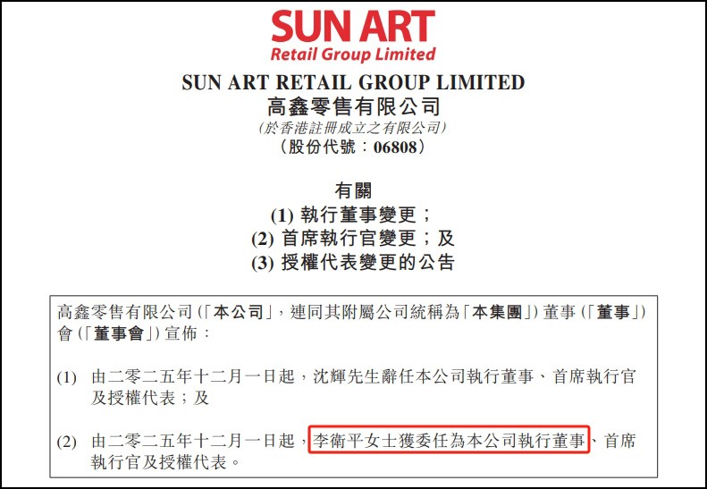 11月30日晚間,高鑫零售有限公司在港交所發(fā)布公告:李衛(wèi)平擔(dān)任高鑫零售執(zhí)行董事兼首席執(zhí)行官,沈輝因家庭事務(wù)原因辭任高鑫零售執(zhí)行董事、首席執(zhí)行官職務(wù),相關(guān)人事變動均自 2025 年 12 月 1日起正式生效。 高鑫零售董事會肯定沈輝為公司戰(zhàn)略落地與業(yè)務(wù)升級付出的努力,任期內(nèi),沈輝始終懷揣對零售事業(yè)的赤誠與熱忱,錨定“回歸零售本質(zhì)”的核心方向,重塑品牌“價格競爭力”與“商品力”;并布局“中超模型”的落地探索,為集團(tuán)展店擴(kuò)張與規(guī)模增長筑牢核心引擎。他以躬身一線的堅(jiān)守、以身作則的擔(dān)當(dāng),為高鑫零售的穩(wěn)健發(fā)展傾注心血。董事會為其在任職期間為集團(tuán)所作出的寶貴貢獻(xiàn)致以最衷心的感謝。 李衛(wèi)平的履新,是高鑫零售戰(zhàn)略布局的重要落子,更是行業(yè)經(jīng)驗(yàn)與企業(yè)愿景的深度契合。高鑫零售正處改革攻堅(jiān)關(guān)鍵節(jié)點(diǎn),沈輝奠定的堅(jiān)實(shí)根基為轉(zhuǎn)型筑牢底盤,李衛(wèi)平則攜前沿行業(yè)視野與資深實(shí)戰(zhàn)經(jīng)驗(yàn),引領(lǐng)企業(yè)向零售新范式全速邁進(jìn)。公告顯示,李衛(wèi)平已在零售行業(yè)深耕26年,她于2018 年加入盒馬,先后擔(dān)任華北北京大區(qū)總經(jīng)理、盒馬鮮生 CEO、盒馬首席商品官等重要職務(wù),帶領(lǐng)盒馬團(tuán)隊(duì)從區(qū)域扭虧為盈到負(fù)責(zé)全國業(yè)態(tài),她的職業(yè)道路始終圍繞“商品為核、服務(wù)為翼”,鏈接這兩者的,是充滿戰(zhàn)斗力和創(chuàng)新精神的組織。她敏捷創(chuàng)新的管理智慧,精準(zhǔn)契合高鑫零售戰(zhàn)略規(guī)劃的核心訴求,董事會期待她為企業(yè)注入全新發(fā)展動能。 展望前路,李衛(wèi)平從三大維度擘畫藍(lán)圖,商品端,將商品品質(zhì)提升至顧客新的要求與標(biāo)準(zhǔn);深化供應(yīng)商戰(zhàn)略協(xié)同,溯源直采,優(yōu)化效率,以品質(zhì)、差異化與性價比的三重優(yōu)勢,持續(xù)為用戶帶來淘貨驚喜;組織端,回歸創(chuàng)業(yè)公司的沖勁和執(zhí)行力,將打造敏捷決策機(jī)制,鼓勵試錯迭代,“以戰(zhàn)代練“完善競爭激勵體系,提供清晰的職業(yè)發(fā)展通道,激活每一位同仁的奮進(jìn)力量;業(yè)態(tài)端,以人文關(guān)懷賦能消費(fèi)體驗(yàn),將加速門店調(diào)改升級與多業(yè)態(tài)協(xié)同布局,推動線上線下深度融合,持續(xù)擴(kuò)大用戶規(guī)模與品牌影響力,筑牢千萬用戶信賴的商業(yè)根基。 “照顧同仁、服務(wù)顧客、精益求精”的核心價值觀,是高鑫零售穿越近三十年風(fēng)雨的精神密碼;而“新鮮、便宜、舒適、便利”的初心堅(jiān)守,是企業(yè)行穩(wěn)致遠(yuǎn)的根本遵循。如今,李衛(wèi)平懷揣對零售事業(yè)的赤誠與大潤發(fā)“家文化”的深刻認(rèn)同,主動融入高鑫零售,將個人深耕行業(yè)的積淀與企業(yè)的文化基因深度契合,以用戶需求為羅盤,以創(chuàng)新變革為風(fēng)帆,以團(tuán)隊(duì)聚力為船槳,在零售行業(yè)的浩瀚海洋中勇毅前行。 截至目前,高鑫零售旗下?lián)碛写鬂櫚l(fā)、大潤發(fā)Super、M會員商店三個主力業(yè)態(tài)品牌,在全國已開出500多家門店,覆蓋29個省市自治區(qū)內(nèi)205個城市,大潤發(fā)優(yōu)鮮等線上平臺用戶達(dá)到1億。 |