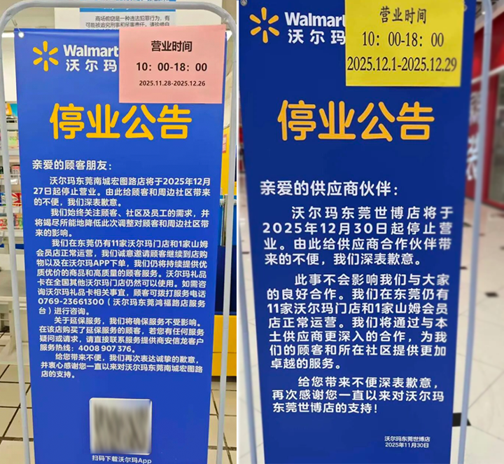 11月30日,沃爾瑪東莞世博店宣布將于12月30日停止?fàn)I業(yè)。同時(shí),營業(yè)時(shí)間也有變化:2025年12月1日-2025年12月29日營業(yè)時(shí)間為10:00-18:00。公告表示,該閉店后東莞仍有11家大賣場和1家山姆會員店繼續(xù)服務(wù)。資料顯示,該店2003年隨東城世博廣場一同開業(yè),是東莞首批大型綜合超市之一,至今已運(yùn)營22年。 兩天前,沃爾瑪東莞南城宏圖路店發(fā)布《停業(yè)公告》,將于12月27日停止?fàn)I業(yè),11月28日-12月26日營業(yè)時(shí)間同樣調(diào)整為10:00-18:00。資料顯示,該店位于南城區(qū)宏圖大道中天中央廣場,2010年10月開業(yè),2022年剛完成升級,至今經(jīng)營15年。 公開資料顯示,1997年,沃爾瑪東莞首店——東城東湖花園店開門迎客,隨后陸續(xù)在城區(qū)及虎門、長安、鳳崗、大朗等鎮(zhèn)街布點(diǎn),形成今天的門店網(wǎng)絡(luò)。對于關(guān)店原因,公告中并未說明。不少網(wǎng)友留言猜測:租金高企、線上沖擊、停車?yán)щy,以及公司轉(zhuǎn)向山姆會員店和社區(qū)小型業(yè)態(tài),是主要因素。 |