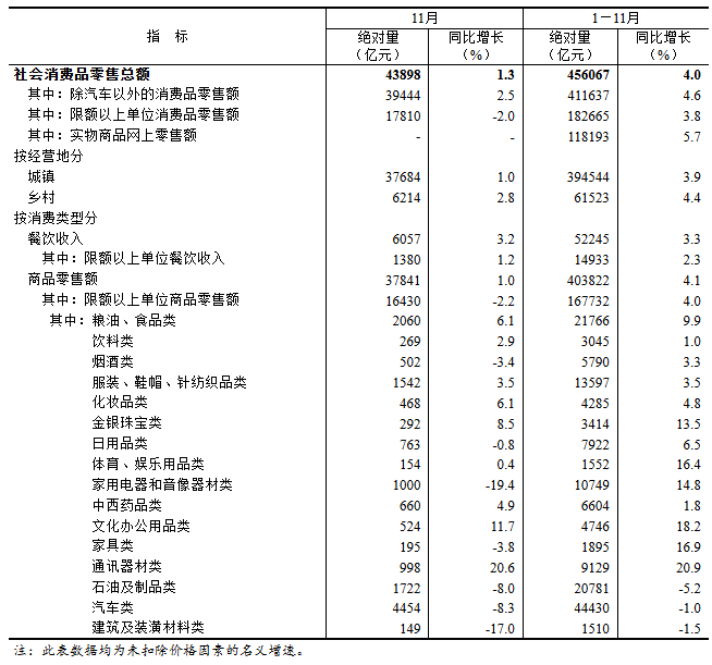 12月15日,據(jù)國家統(tǒng)計局消息,11月份,社會消費(fèi)品零售總額43898億元,同比增長1.3%。其中,除汽車以外的消費(fèi)品零售額39444億元,增長2.5%。1-11月份,社會消費(fèi)品零售總額456067億元,增長4.0%。其中,除汽車以外的消費(fèi)品零售額411637億元,增長4.6%。 按經(jīng)營單位所在地分,11月份,城鎮(zhèn)消費(fèi)品零售額37684億元,同比增長1.0%;鄉(xiāng)村消費(fèi)品零售額6214億元,增長2.8%。1-11月份,城鎮(zhèn)消費(fèi)品零售額394544億元,增長3.9%;鄉(xiāng)村消費(fèi)品零售額61523億元,增長4.4%。 按消費(fèi)類型分,11月份,商品零售額37841億元,同比增長1.0%;餐飲收入6057億元,增長3.2%。1-11月份,商品零售額403822億元,增長4.1%;餐飲收入52245億元,增長3.3%。 1-11月份,全國網(wǎng)上零售額144582億元,同比增長9.1%。其中,實物商品網(wǎng)上零售額118193億元,增長5.7%,占社會消費(fèi)品零售總額的比重為25.9%;在實物商品網(wǎng)上零售額中,吃類、穿類、用類商品分別增長14.9%、3.5%、4.4%。 |
