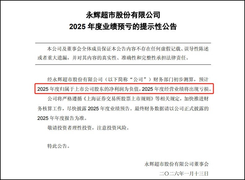 1月12日,永輝超市公告,經(jīng)公司財務(wù)部門初步測算,預(yù)計2025年度歸屬于上市公司股東的凈利潤為負(fù)值,2025年度經(jīng)營業(yè)績將出現(xiàn)虧損。公司將嚴(yán)格遵循《上海證券交易所股票上市規(guī)則》等相關(guān)規(guī)定,加快推進(jìn)財務(wù)核算工作,盡快披露2025年度業(yè)績預(yù)告。最終財務(wù)數(shù)據(jù)請以公司正式披露的2025年年度報告為準(zhǔn)。 根據(jù)公司2025年三季報,2025年前三季度,永輝超市實(shí)現(xiàn)營業(yè)收入424.34億元,同比下降22.21%;前三季度利潤總額-7.72億元,歸母凈利潤為-7.10億元,扣非后歸母凈利潤為-15.02億元,較上年同期分別下降6.50億元、6.32億元、8.40億元。 |